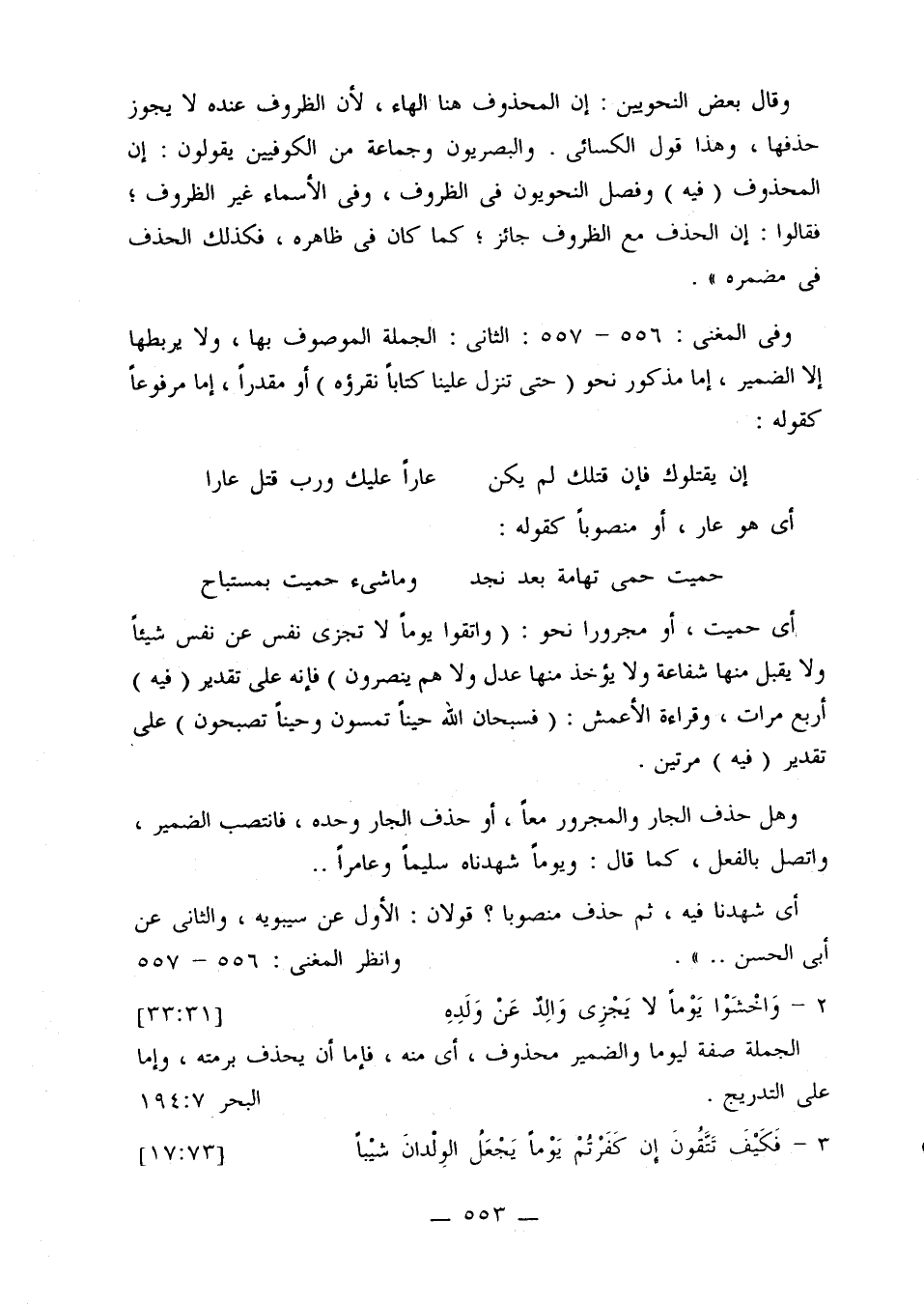 أي حميت، أو مجرورًا نحو: (وَاتَّقُوا يَوْمًا لا تَجْزِي نَفْسٌ عَنْ نَفْسٍ شَيْئًا وَلا يُقْبَلُ مِنْهَا شَفَاعَةٌ وَلا يُؤْخَذُ مِنْهَا عَدْلٌ وَلا هُمْ يُنْصَرُونَ) فإنه على تقدير (فيه) أربع مرات، وقراءة الأعمش: (فسبحان الله حينا تمسون وحينا تصبحون) على تقدير (فيه) مرتين.