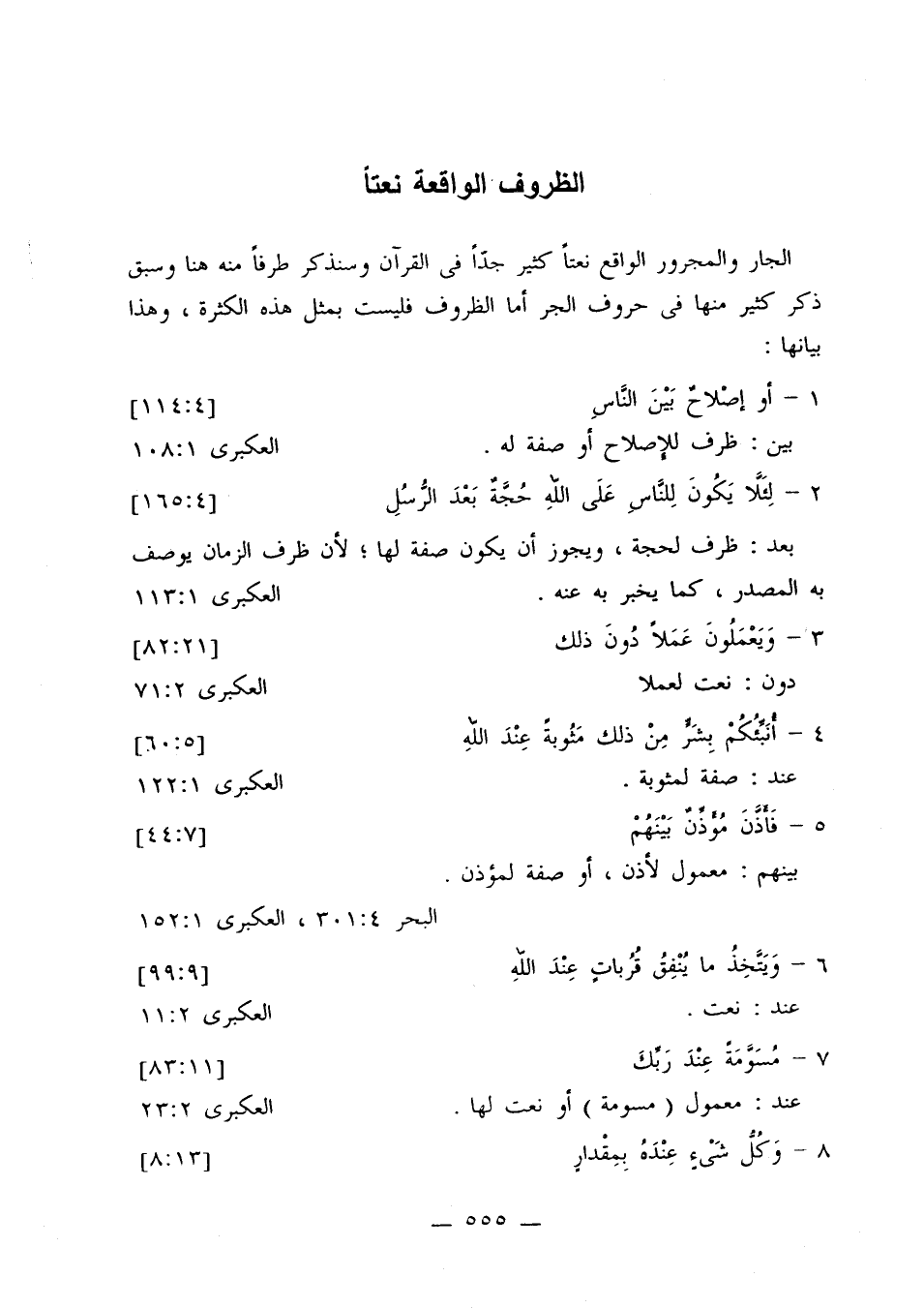 الجار والمجرور الواقع نعتا كثير جدا في القرآن وسنذكر طرفا منه هنا وسبق ذكر كثير منها في حروف الجر أما الظروف فليست بمثل هذه الكثرة، وهذا بيانها: