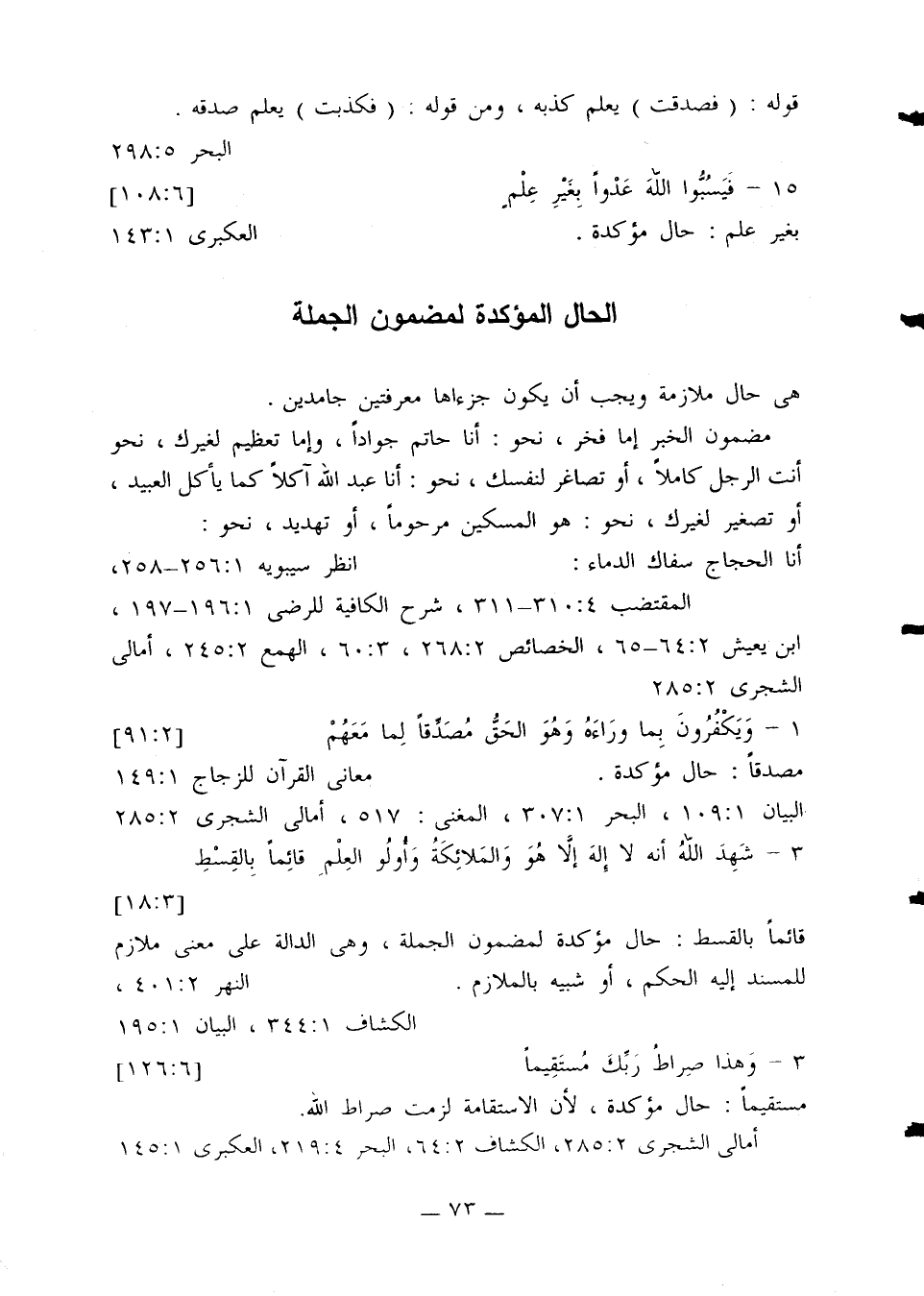 مضمون الخبر إما فخر، نحو: أنا حاتم جوادا، وإما تعظيم لغيرك، نحو أنت رجلا كاملا، أو تصاغر لنفسك، نحو: هو المسكين مرحوما، أو تهديد، نحو: أنا الحجاج سفاك الدماء: انظر سيبويه 256:1 - 258