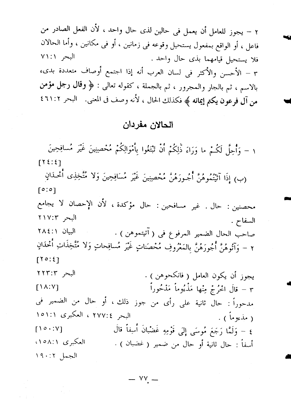 2 - يجوز للعامل أن يعمل في حالين لذي حال واحد، لأن الفعل الصادر من فاعل، أو الواقع بمفعول يستحيل وقوعه في زمانين، أو في مكانين، وأما الحالان فلا يستحيل قيامهما بذي حال واحد. البحر 71:1