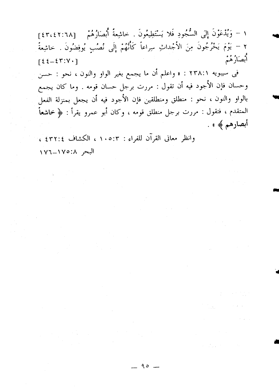 في سيبويه 238:1 «واعلم أن ما يجمع بغير الواو والنون، نحو: حسن وحسان فإن الأجود فيه أن تقول: مررت برجل حسان قومه. وما كان يجمع بالواو والنون، نحو: منطلق ومنطلقين فإن الأجود فيه أن يجعل بمنزلة الفعل المتقدم، فتقول: مررت برجل منطلق قومه، وكان أبو عمرو يقرأ: {خاشعًا أبصارهم}».