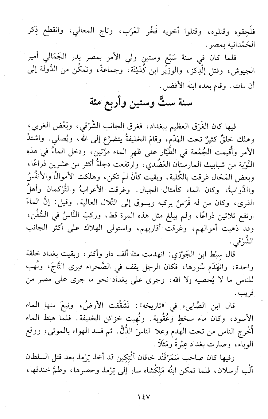 فيها كان الغرق العظيم ببغداد، فغرق الجانب الشرقي، وبعض الغربي، وهلك خلق كثير تحت الهدم. وقام الخليفة يتضرع إلى اللَّه، ويصلي. واشتد الأمر وأقيمت الجمعة في الطيار على ظهر الماء مرتين، ودخل الماء في هذه النوبة من شبابيك المارستان العضدي. وارتفعت دجلة أكثر من عشرين ذراعًا، وبعض المحال غرقت بالكلية، وبقيت كأن لم تكن. وهلكت الأموال والأنفس والدواب. وكان الماء كأمثال الجبال. وغرقت الأعراب والتركمان وأهل القرى. وكان من له فرس يركبه ويسوق إلى التلال العالية. وقيل: إن الماء ارتفع ثلاثين ذراعًا. ولم يبلغ مثل هذه المرة قط، وركب الناس في السفن، وقد ذهبت أموالهم، وغرقت أقاربهم، واستولى الهلاك على أكثر الجانب الشرقي.