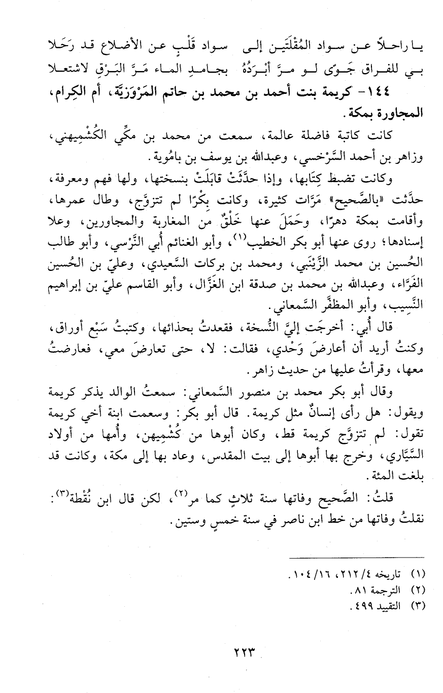 144 - كريمة بنت أحمد بن محمد بن حاتم المروزية، أمّ الكِرام، [المتوفى: 465 هـ]