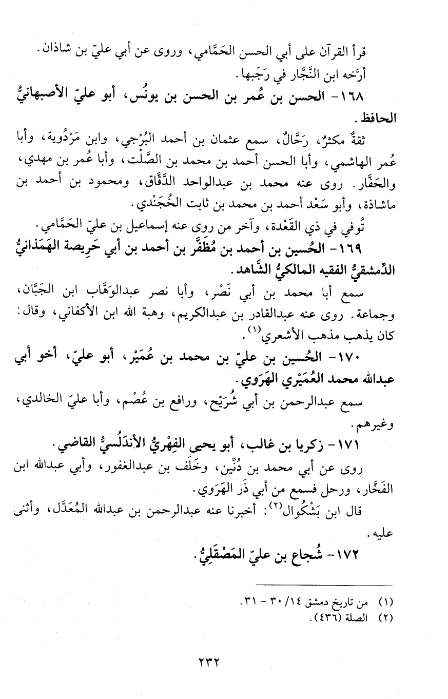 169 - الْحُسَيْن بْن أَحْمَد بْن مظفّر بْن أحمد بن أبي حريصة الهمذاني الدّمشقي، الفقيه المالكيّ الشّاهد. [المتوفى: 466 هـ]