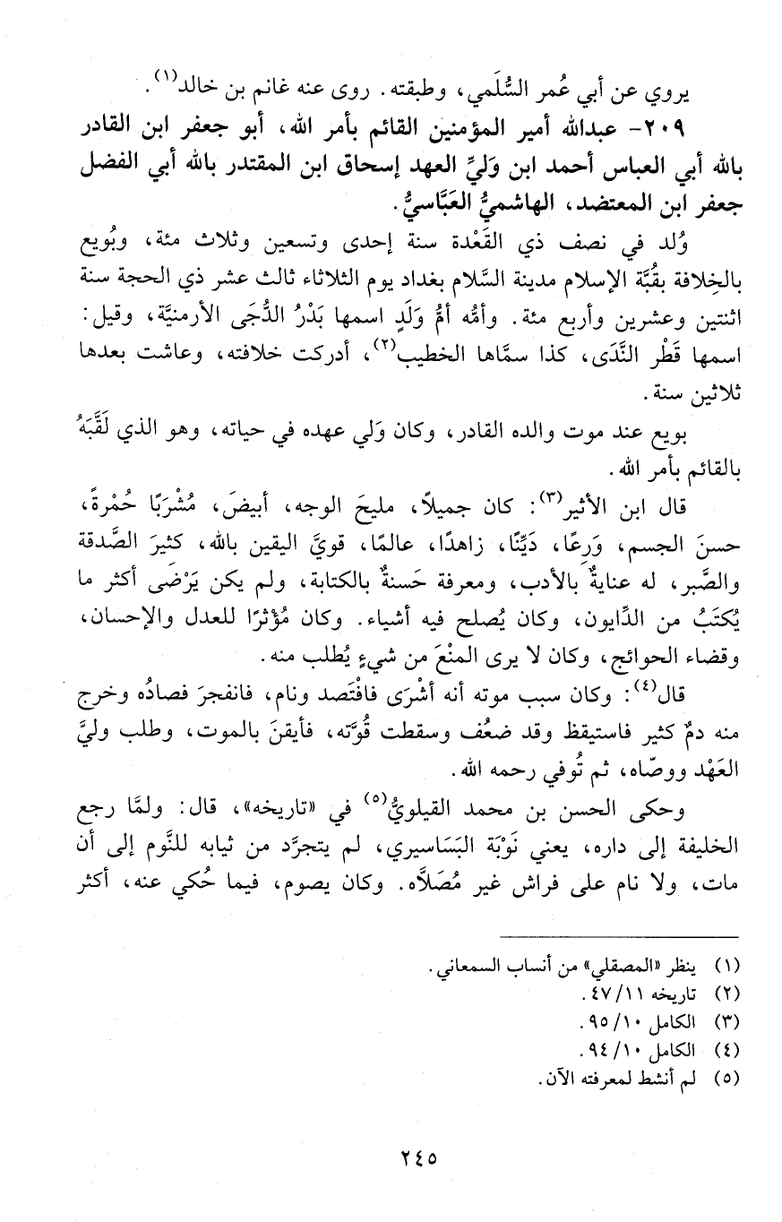 209 - عَبْد اللَّه أمير المؤمنين القائم بأمر اللَّه، أبو جعفر ابن القادر بالله أبي العباس أحمد ابن ولي العهد إسحاق ابن المقتدر بالله أبي الفضل جعفر ابن المعتضد، الهاشمي العباسي. [المتوفى: 467 هـ]