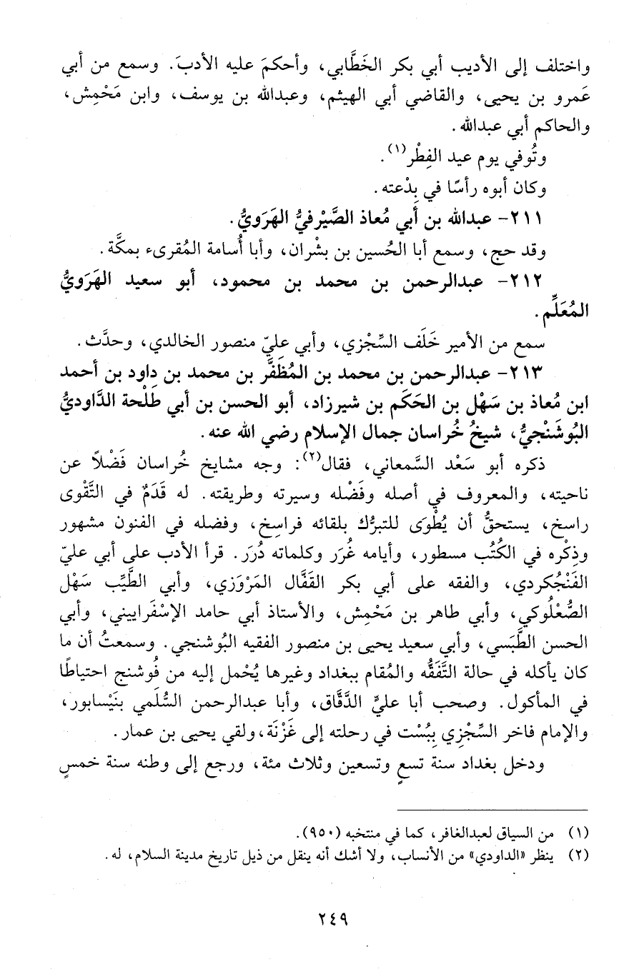 213 - عَبْد الرَّحْمَن بْنُ مُحَمَّد بْن المظفر بْن مُحَمَّد بْن دَاوُد بْن أَحْمَد بْن مُعَاذ بْن سهل بْن الحكم بْن شيرزاد، أبو الْحَسَن بْن أَبِي طلحة الداودي البوشنجي، شيخ خُراسان جمال الْإِسْلَام رَضِيَ اللَّه عَنْهُ. [المتوفى: 467 هـ]