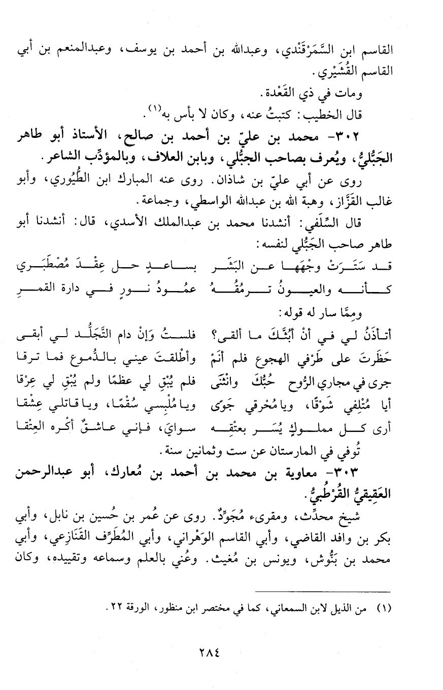 302 - مُحَمَّد بْن عليّ بْن أَحْمَد بْن صالح، الأستاذ أبو طاهر الجبُّلي، ويُعرف بصاحب الجبُّلي، وبابن العلّاف، وبالمؤدِّب الشاعر. [المتوفى: 469 هـ]