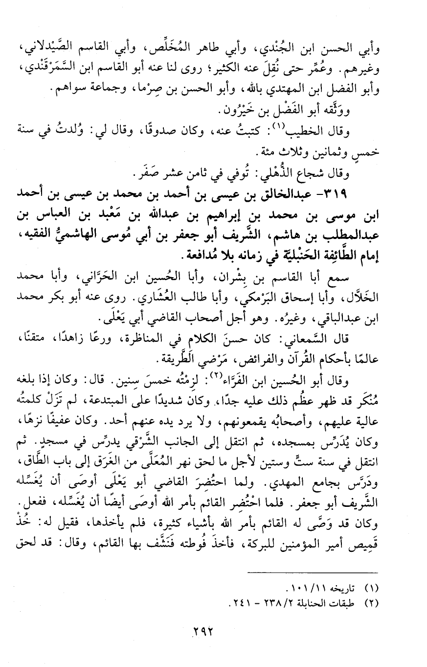 319 - عَبْد الخالق بْن عِيسَى بْن أَحْمَد بْن مُحَمَّد بْن عِيسَى بْن أَحْمَد بْن مُوسَى بْن مُحَمَّد بْن إِبْرَاهِيم بْن عَبْد اللَّه بْن مَعْبَدِ بْنِ العباس بن عبد المطلب بْن هاشم، الشريف أبو جَعْفَر بْن أَبِي مُوسَى الهاشميّ الفقيه، [المتوفى: 470 هـ]