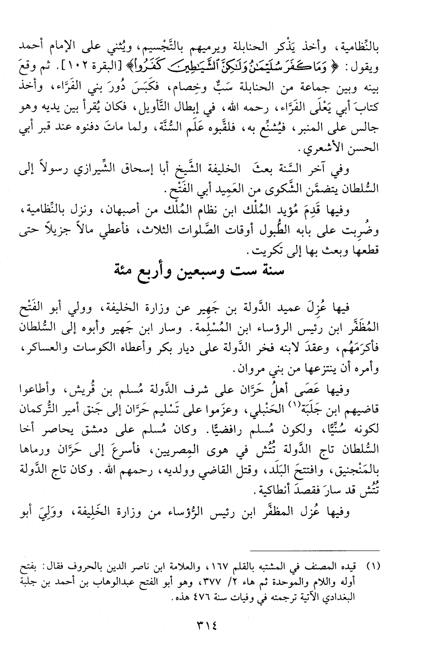 وفيها عزل المظفر ابن رئيس الرؤساء من وزارة الخليفة، وولي أبو -[315]- شجاع محمد بن الحُسين، ولقّبه الخليفة ظهير الدين، ومدحته الشعراء فأكثروا.