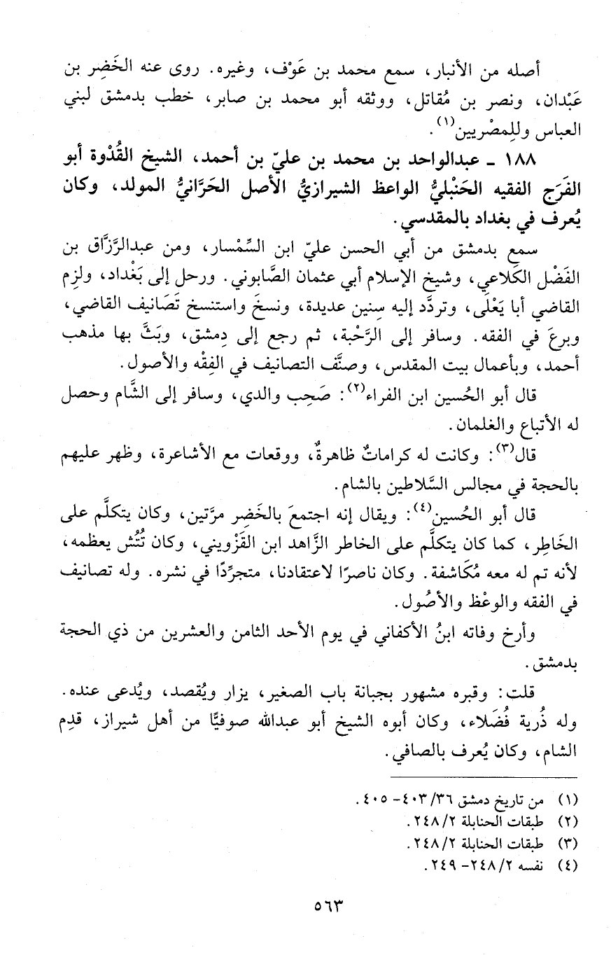 188 - عبد الواحد بن محمد بن عليّ بن أحمد، الشّيخ القُدْوة، أبو الفَرَج الفقيه الحنبليّ، الواعظ الشّيرازيّ الأصل الحرّانيّ المولد، وكان يُعرف في بغداد بالمقدسيّ. [المتوفى: 486 هـ]