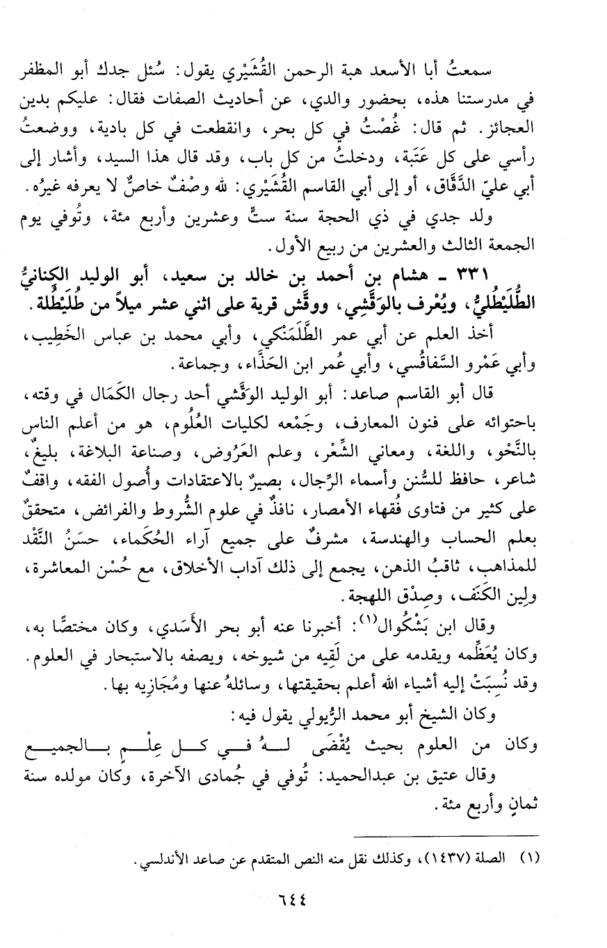 331 - هشام بن أحمد بن خالد بن سعيد، أبو الوليد الكِنانيّ الطُّلَيْطُلِيّ، ويُعرف بالوَقَّشِيّ، [المتوفى: 489 هـ]
