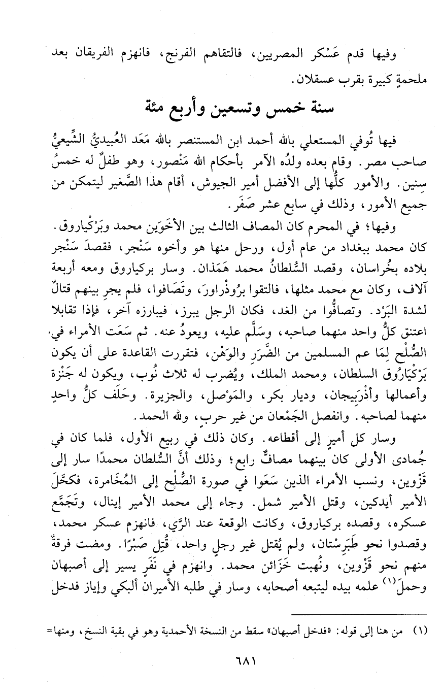 وسار كل أمير إلى أقطاعه، وكان ذلك في ربيع الأول، فلمّا كَانَ في جُمَادَى الأولى كَانَ بينهما مصافّ رابع، وذلك أنّ السّلطان محمدًا سار إلى قَزْوين، ونسب الأمراء الذين سعوا في صورة الصُّلْح إلى المخامرة، فكحل الأمير أيدكين، وقتل الأمير شمل، وجاء إلى محمد الأمير إينال، وتجمع عسكره، وقصده بَركيَارُوق، وكانت الوقعة عند الرّيّ، فانهزم عسكر محمد، وقصدوا نحو طَبَرِسْتان، ولم يُقتل غير رجل واحد، قتل صبراً، ومضت فرقة منهم نحو قَزْوين، ونهبت خزائن محمد، وانهزم في نفر يسير إلى أصبهان وحمل علمه بيده ليتبعه أصحابه، وسار في طلبه الأميران ألبكي وإياز فدخل -[682]- إصبهان في سبعين فارسًا، وحصنها ونصب مجانيقها، وكان معه بها ألف فارس، وتبعه بَركيَارُوق بجيوش كثيرة تزيد على خمسة عشر ألفا، فحاصره وضيّق عَلَيْهِ، وكان محمد يدور كلّ ليلةٍ عَلَى السّور ثلاث مرّات. وعدمت الأقوات، فأخرج من البلد الضُّعفاء، واستقرض محمد من أعيان البلد أموالًا عظيمة، وعثرهم وصادرهم، واشتد عليهم القحط، وهانت قيم الأمتعة، وكانت الأسعار عَلَى بَركيَارُوق رخيصة.