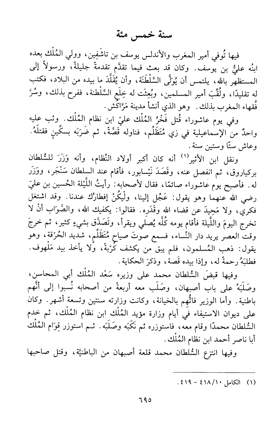 فيها تُوُفّي أمير المغرب والأندلس يوسف بْن تاشَفِين، وولي المُلْك بعده ابنه عليُّ بْنُ يوسف، وكان قد بعث فيما تقدَّم تقدمةً جليلة، ورسولًا إلى المستظهر باللَّه، يلتمس أنّ يولى السلطة، وأن يُقَلَّدَ ما بيده من البلاد، فكتب له تقليداً، ولقب أمير المسلمين، وبعثت لَهُ خِلَع السّلطنة، ففرح بذلك، وسُرَّ فُقهاء المغرب بذلك، وهو الّذي أنشأ مدينة مَرّاكُش.