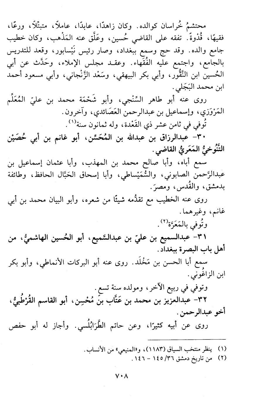 30 - عَبْد الرّزّاق بْن عَبْد اللَّه بْن المحسِّن، أبو غانم بن أبي حصين التّنُوخيّ المَعَرّيّ القاضي. [المتوفى: 491 هـ]