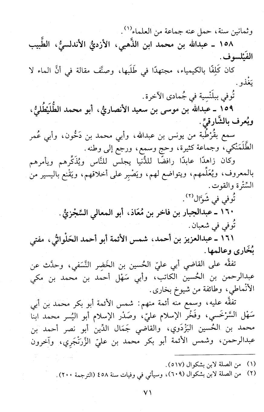 159 - عبد اللَّه بن موسى بن سعيد الأنصاريّ، أبو محمد الطُّلَيْطُليّ، ويُعرف بالشّارِقيّ. [المتوفى: 456 هـ]