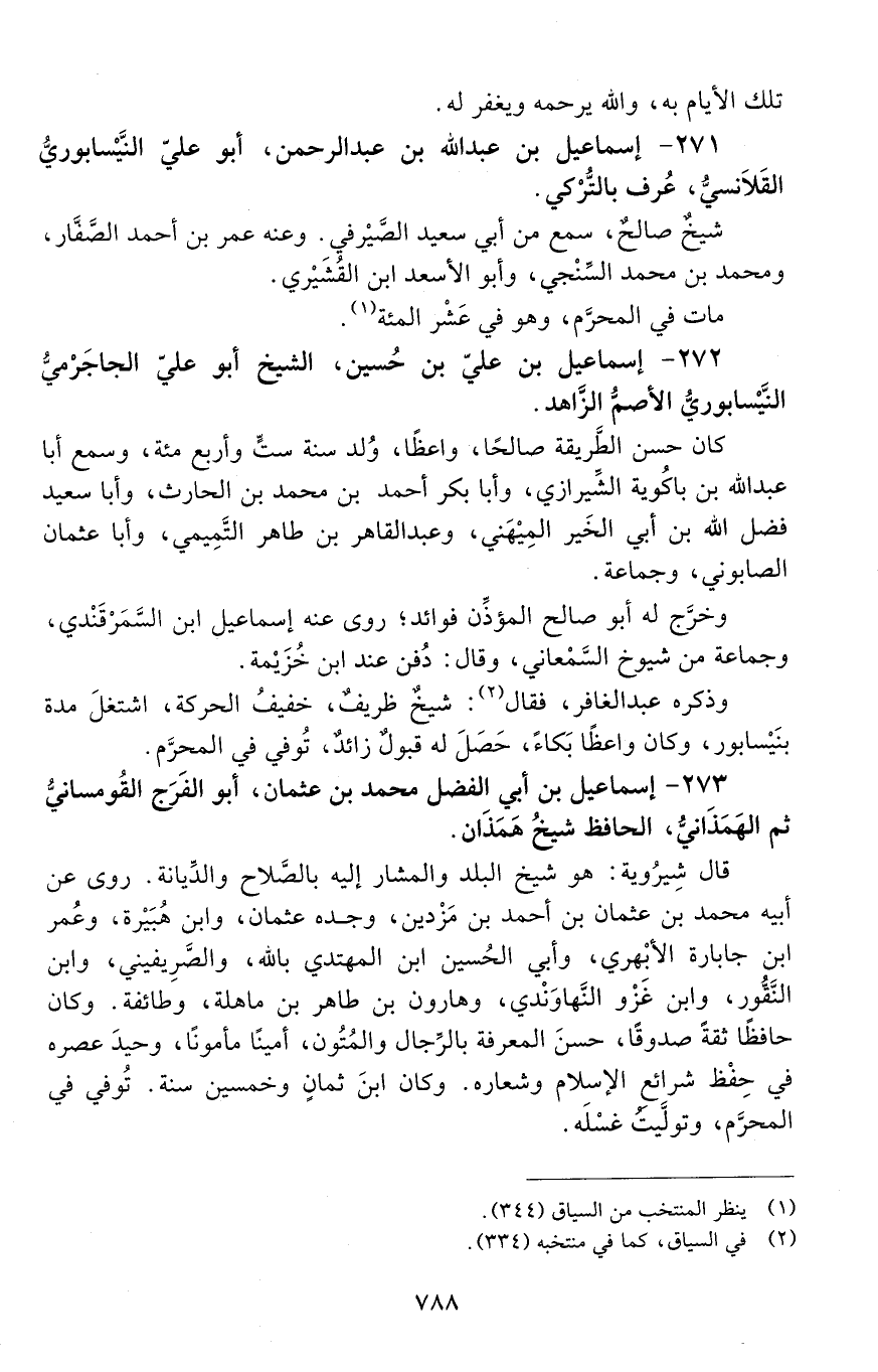 271 - إسماعيل بْن عَبْد اللَّه بْن عَبْد الرَّحْمَن، أبو عليّ النَّيْسابوريّ القلانسي، عُرِف بالتُّرْكيّ. [المتوفى: 497 هـ]