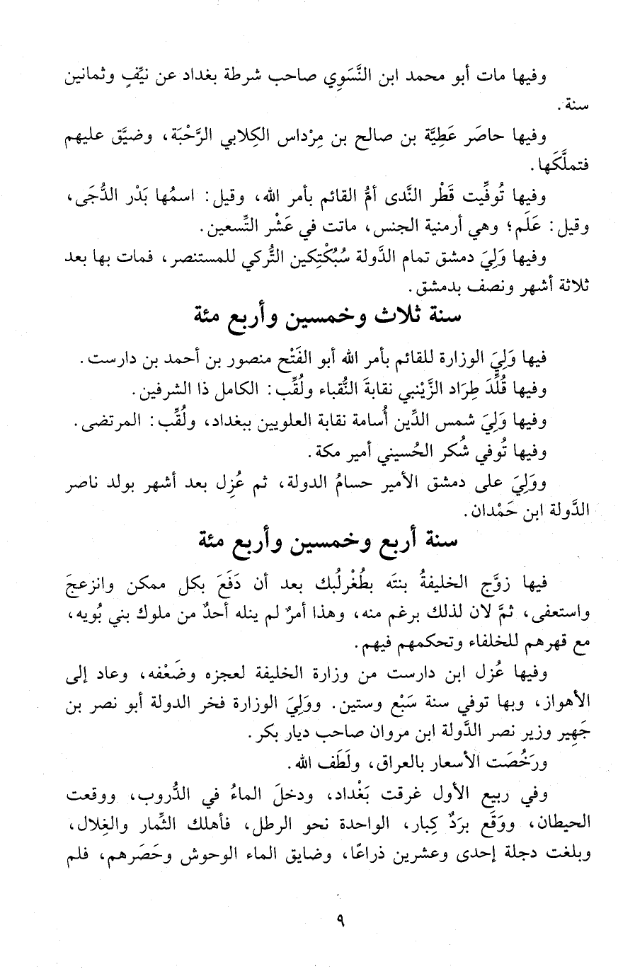وفي ربيع الأوّل غرقت بغداد، ودخل الماء في الدُّروب، ووقعت الحيطان، ووقع بردٌ كِبار، الواحدة نحو الرَّطل، فأهلك الثِّمار والغِلال، وبلغت دِجلة إحدى وعشرين ذراعًا، وضايق الماء الوحوش وحصرهم، فلم -[10]- يكن بهم مسلك، فكان أهل السّواد يسبحون ويأخذونهم بلا كلفة.