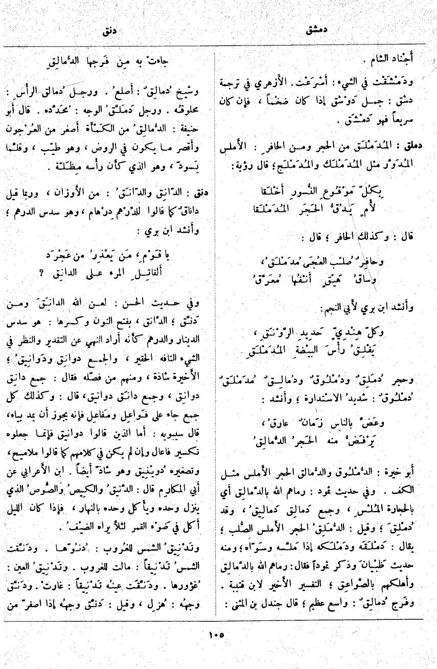 دملق: المُدَمْلَق مِنَ الْحَجَرِ وَمِنَ الحافرِ: الأَملس المُدَوَّر مِثْلُ المُدَمْلَك والمُدَمْلَج؛ قَالَ رُؤْبَةُ: