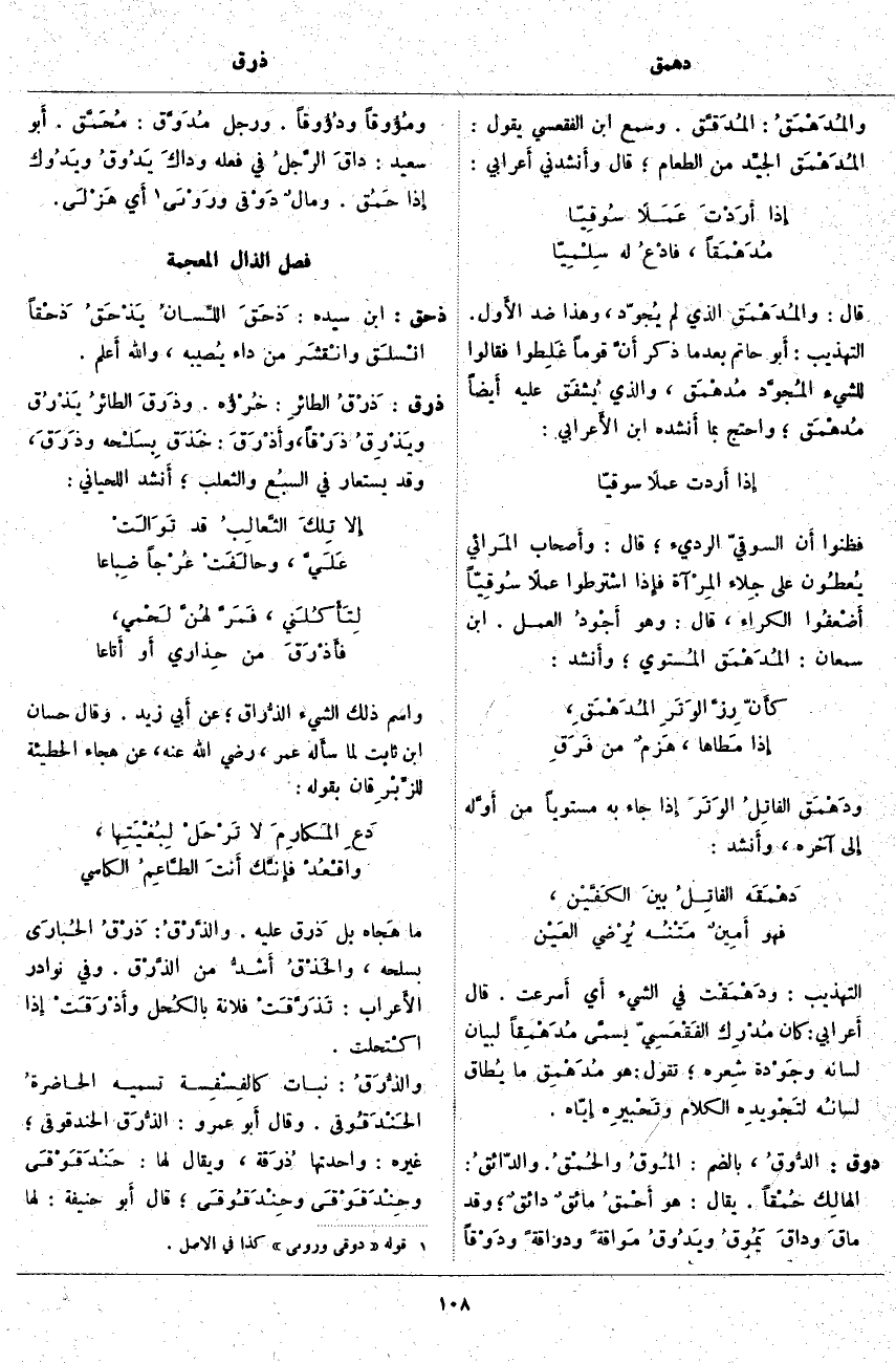 دَوَقَ: الدُّوقُ، بِالضَّمِّ: المُوقُ والحُمْقُ. والدّائقُ: الهالِك حُمْقاً. يُقَالُ: هُوَ أحْمقُ مائقٌ دائقٌ؛ وَقَدْ ماقَ وداقَ يَمُوقُ ويَدُوقُ مَواقةً وَدَوَاقَةً ودَوْقاً ومُؤُوقاً ودُؤُوقاً. وَرَجُلٌ مُدَوَّق: مُحَمَّق. أَبُو سَعِيدٍ: داقَ الرَّجلُ فِي فِعْلِهِ وداكَ يَدُوقُ ويَدُوك إِذَا حَمُق. ومالٌ دَوْقى ورَوبَى «2» أي هَزْلَى.