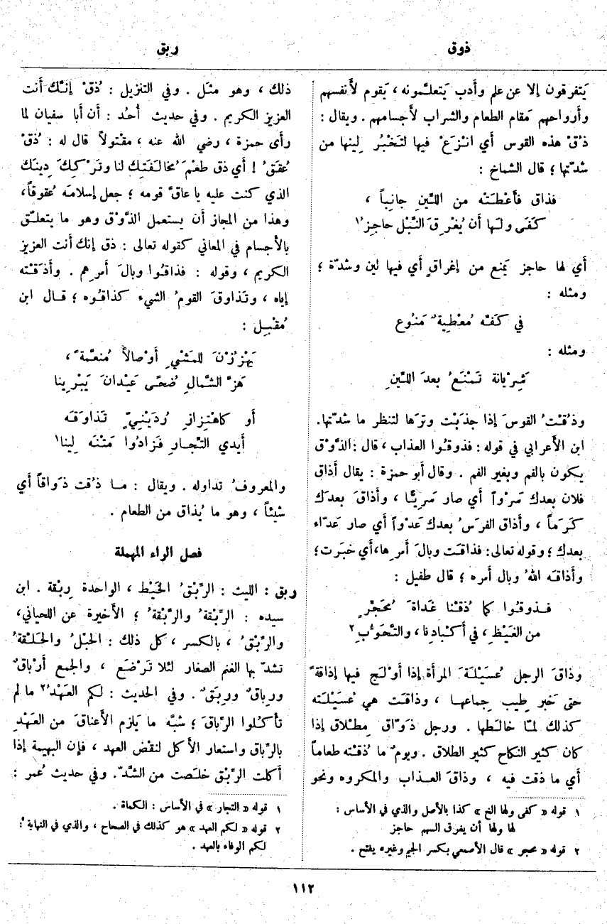 يَتفرقون إِلا عَنْ عِلْمٍ وأَدب يَتعلَّمونه، يَقوم لأَنفسهم وأَرواحهم مَقام الطَّعَامِ وَالشَّرَابِ لأَجسامهم. وَيُقَالُ: ذُقْ هَذِهِ القوس أَي انْزَعْ فيها لتَخْبُر لِينها مِنْ شِدَّتِهَا؛ قَالَ الشَّمَّاخُ: