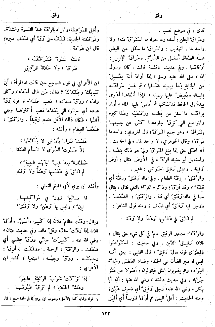وَاسْتَعْمَلَ أَبو حَنِيفَةَ الرِّقَّة فِي الأَرض فَقَالَ: أَرض رَقيقة. وَعَيْشٌ رَقيق الحَواشي: ناعِم. والرَّقَقُ: رِقَّة الطَّعَامِ. وَفِي مَالِهِ رَقَقٌ ورقَّة أَي قِلَّةٌ، وَقَدْ أَرَقَّ؛ وَذَكَرَهُ الفرَّاءُ بِالنَّفْيِ فَقَالَ: يُقَالُ مَا فِي مَالِهِ رَقَقٌ أَي قِلَّةٌ. والرَّقَقُ: الضَّعْفُ. وَرَجُلٌ فِيهِ رَقَقٌ أَي ضَعف؛ وَمِنْهُ قَوْلُ الشَّاعِرِ: