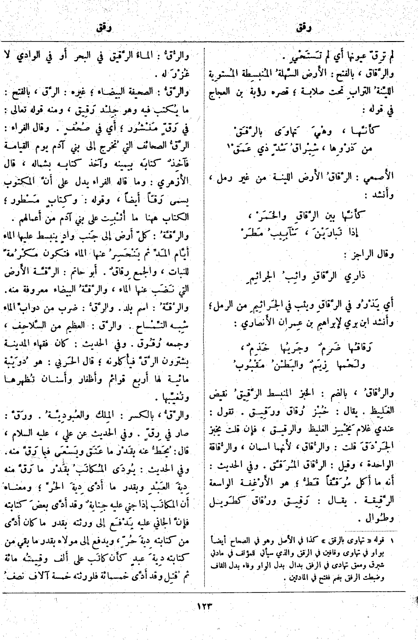 ؛ هُوَ الأَرْغِفة الْوَاسِعَةُ الرَّقِيقة. يُقَالُ: رَقِيق ورُقاق كطَويل وطُوال. والرُّقُّ: الماءُ الرَّقيق فِي الْبَحْرِ أَو فِي الْوَادِي لَا غُزْرَ لَهُ. والرَّقُّ: الصَّحِيفَةُ الْبَيْضَاءُ؛ غَيْرُهُ: الرَّق، بِالْفَتْحِ: مَا يُكتب فِيهِ وَهُوَ جِلْد رَقِيق، وَمِنْهُ قَوْلُهُ تَعَالَى: فِي رَقٍّ مَنْشُورٍ