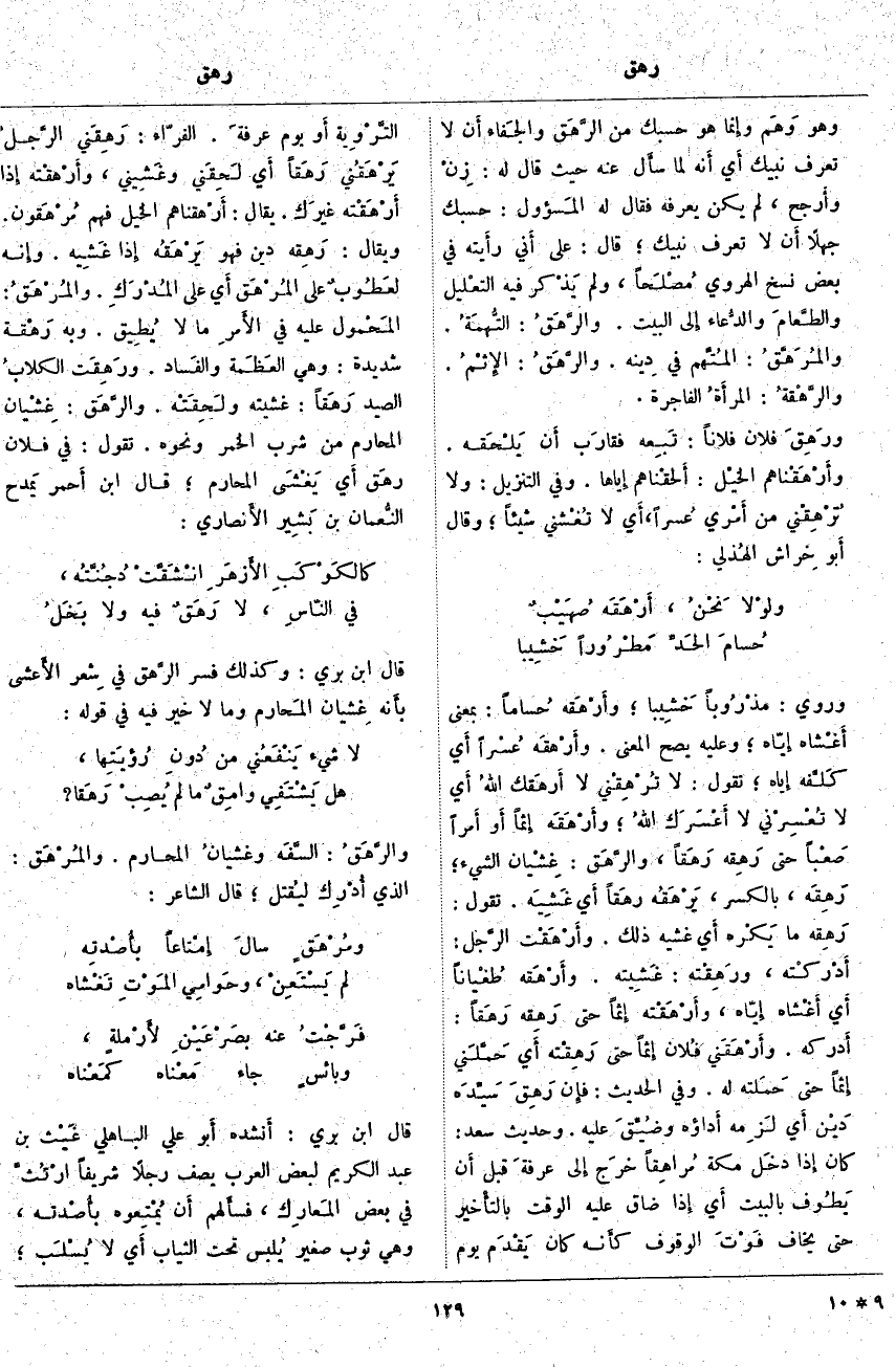 وَهُوَ وَهَم وإِنما هُوَ حَسْبُكَ مِنَ الرَّهَق والجَفاء أَن لَا تَعْرِفَ نَبِيَّكَ أَي أَنه لَمَّا سأَل عَنْهُ حَيْثُ قَالَ لَهُ: زِنْ وأَرجح، لَمْ يَكُنْ يعرفه فقال له المَسؤول: حَسْبُكَ جَهْلًا أَن لَا تَعْرِفَ نَبِيَّكَ؛ قَالَ: عَلَى أَني رأَيته فِي بَعْضِ نُسَخِ الْهَرَوِيِّ مُصْلَحاً، وَلَمْ يَذْكر فِيهِ التعْليل والطَّعامَ والدُّعاء إِلى الْبَيْتِ. والرَّهَقُ: التُّهمَةُ. والمُرَهَّقُ: المُتَّهم فِي دِينه. والرَّهَقُ: الإِثْمُ. والرَّهْقةُ: المرأَةُ الْفَاجِرَةُ. ورَهِقَ فُلَانٌ فُلَانًا: تَبِعه فقارَب أَن يَلْحَقه. وأَرْهَقْناهم الخيْل: أَلحقْناهم إِياها. وَفِي التَّنْزِيلِ: وَلا تُرْهِقْنِي مِنْ أَمْرِي عُسْراً