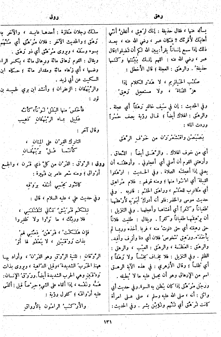 وَيُقَالُ: طَلَبْتُ فُلَانًا حَتَّى رهِقته أَي حَتَّى دنوتُ مِنْهُ، فَرُبَّمَا أَخذه وَرُبَّمَا لَمْ يأْخُذْه. ورَهِق شُخوصُ فُلَانٍ أَي دَنَا وأَزِف وأَفِد. والرهَق: العَظَمة، والرهَق: العيْب، وَالرَّهَقُ: الظُّلْمُ. وَفِي التَّنْزِيلِ: فَلا يَخافُ بَخْساً وَلا رَهَقاً