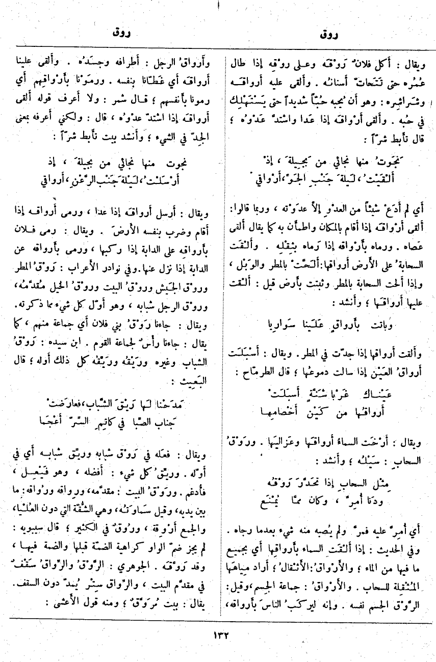 أَي بِجَمِيعِ مَا فِيهَا مِنَ الْمَاءِ؛ والأَرْواقُ: الأَثْقالُ؛ أَراد مِياهَها المُثْقِلة لِلسَّحَابِ. والأَرْواقُ: جَمَاعَةُ الجِسم، وَقِيلَ: الرَّوْق الْجِسْمُ نَفْسُهُ. وإِنه ليركَبُ الناسَ بأَرواقه، وأَرواقُ الرَّجُلِ: أَطرافه وجسَدُه. وأَلقى عَلَيْنَا أَرواقَه أَي غَطّانا بِنَفْسِهِ. ورمَوْنا بأَرْواقِهم أَي رَمَوْنَا بأَنفسهم؛ قَالَ شَمِرٌ: وَلَا أَعرف قَوْلَهُ أَلقى أَرواقَه إِذا اشْتَدَّ عدْوُه، قَالَ: وَلَكِنِّي أَعرفه بِمَعْنَى الجِدّ فِي الشَّيْءِ؛ وأَنشد بَيْتَ تأَبط شَرًّا: