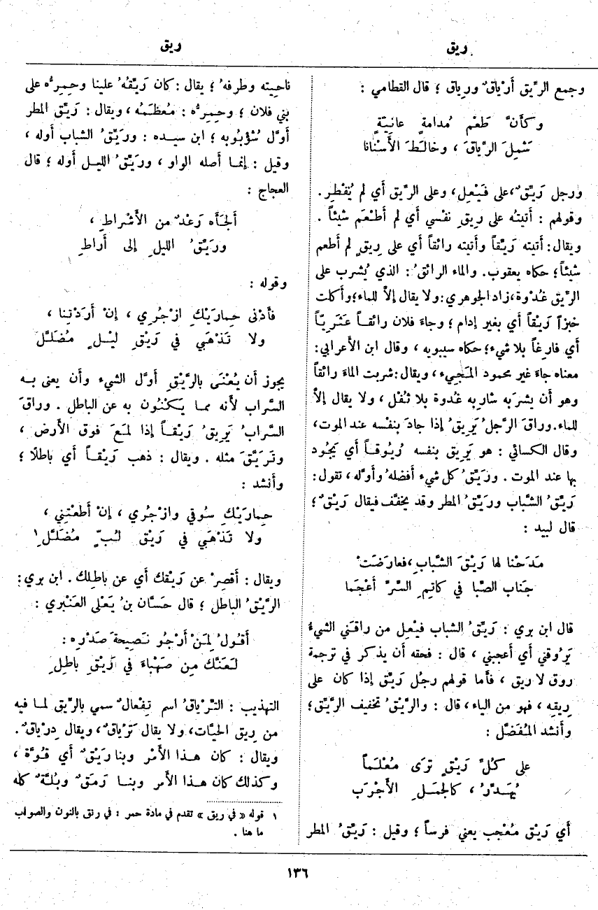 (2). قوله [في ريق] تقدم في مادة حمر: في رنق بالنون والصواب ما هنا