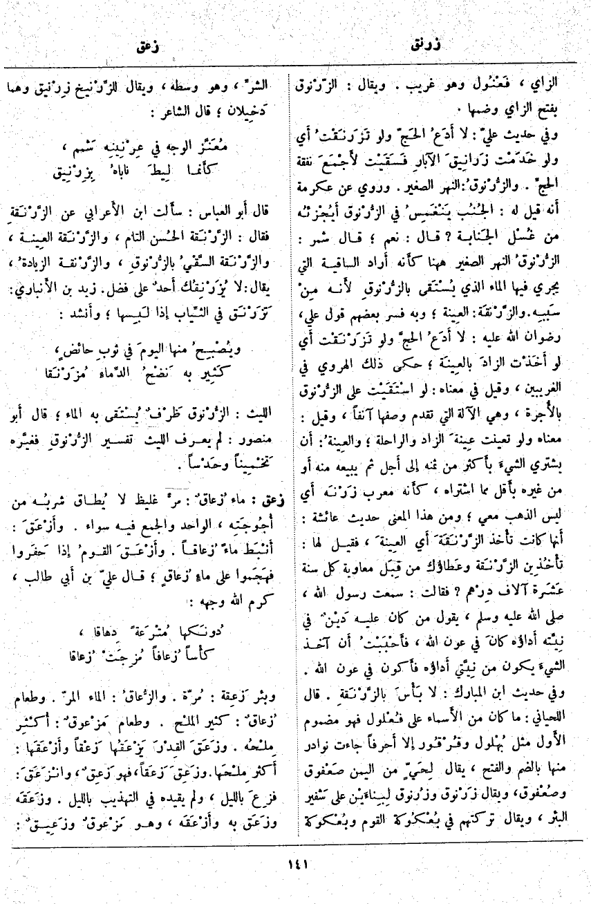 زعق: مَاءٌ زُعاقٌ: مرٌّ غَلِيظٌ لَا يُطاق شربُه مِنْ أُجُوجَتِه، الْوَاحِدُ وَالْجَمْعُ فِيهِ سَوَاءٌ. وأَزْعَقَ: أَنْبَط مَاءً زُعاقاً. وأَزْعَقَ القومُ إِذا حَفَروا فهَجَموا عَلَى ماءٍ زُعاقٍ؛ قَالَ