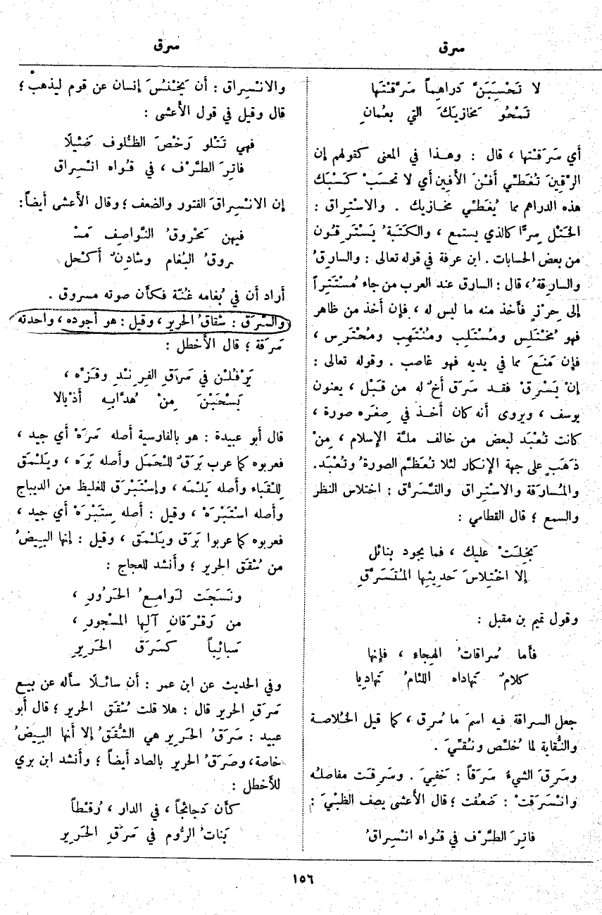 أَيْ سَرَقْتها، قَالَ: وَهَذَا فِي الْمَعْنَى كَقَوْلِهِمْ إِنَّ الرِّقِينَ تُغَطِّي أفْنَ الأَفِينَ أَيْ لَا تحسَبْ كَسْبَك هَذِهِ الدَّرَاهِمَ مِمَّا يُغَطِّي مَخَازِيكَ. والاسْتِراق: الخَتْل سِرًّا كَالَّذِي يَسْتَمِعُ، والكَتَبةُ يَسْتَرِقُون مِنْ بَعْضِ الْحِسَابَاتِ. ابْنُ عَرَفَةَ فِي قَوْلِهِ تَعَالَى: وَالسَّارِقُ وَالسَّارِقَةُ