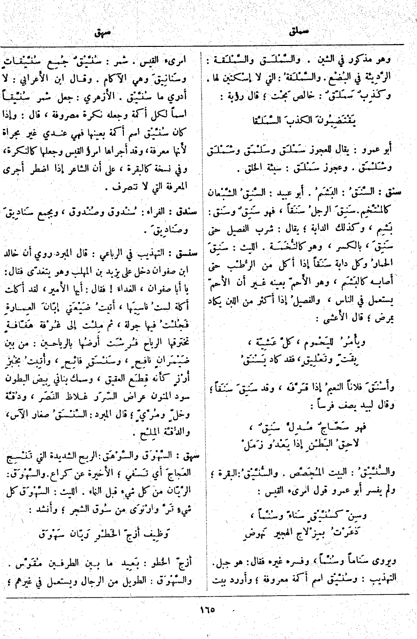 سنسق: التَّهْذِيبُ فِي الرُّبَاعِيِّ: قَالَ الْمُبَرِّدُ رُوِيَ أَنَّ خَالِدَ بْنَ صَفْوَانَ دَخَلَ عَلَى يَزِيدَ بْنِ الْمُهَلَّبِ وَهُوَ يَتَغَدَّى فَقَالَ: يَا أَبَا صَفْوَانَ، الغداءَ فَقَالَ أَيُّهَا الأَمير، لَقَدْ أَكَلْتُ أَكْلَةً لستُ ناسِيَهَا، أتيتُ ضَيْعَتي إبّانَ العِمارةِ فَجُلْتُ فِيهَا جَوْلَةً، ثُمَّ مِلْت إِلَى غُرْفة هَفّافةٍ تَخْتَرِقُهَا الرِّيَاحُ فُرِشَت أرضُها بِالرَّيَاحِينِ: مِنْ بَيْنِ ضَيْمَرَانٍ نافحٍ، وسَنْسَقٍ فائِحٍ، وأُتِيتُ بخُبزِ أرْزٍ كَأَنَّهُ قِطَع الْعَقِيقِ، وَسَمَكٍ بَنَانِيٍّ بِيض الْبُطُونِ سُودِ الْمُتُونِ عِرَاضِ السّرَر غِلَاظِ القَصَر، ودُقَّة وَخَلٍّ ومُرِّيّ؛ قَالَ الْمُبَرِّدُ: السْنسَقُ صِغَارُ الآس، والدُّقَّة المِلْح.