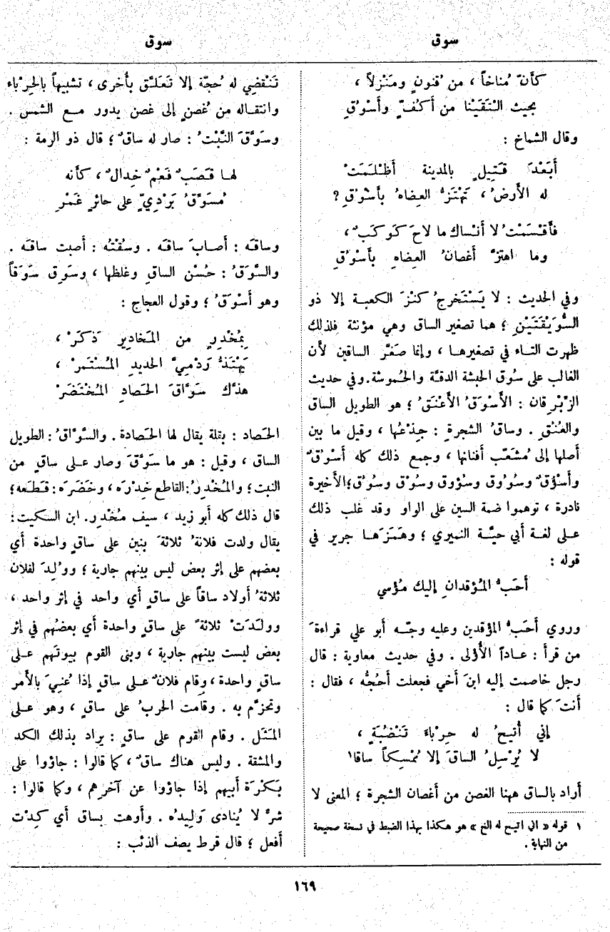 ؛ هُوَ الطَّوِيلُ السَّاقِ والعُنُقِ. وساقُ الشجرةِ: جِذْعُها، وَقِيلَ مَا بَيْنَ أَصلها إِلَى مُشَعّب أَفنانها، وَجَمْعُ ذَلِكَ كُلِّهِ أَسْوُقٌ وأَسْؤُقٌ وسُوُوق وسؤوق وسُوْق وسُوُق؛ الأَخيرة نَادِرَةٌ، تَوَهَّمُوا ضَمَّةَ السِّينِ عَلَى الْوَاوِ وَقَدْ غَلَبَ ذَلِكَ عَلَى لُغَةِ أَبِي حيَّة النُّمَيْرِيِّ؛ وهَمَزَها جَرِيرٌ فِي قَوْلِهِ: