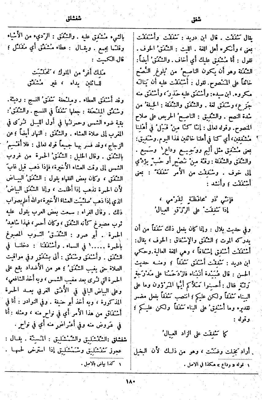 . وَقَالَ الْخَلِيلُ: الشَّفَقُ الْحُمْرَةُ مِنْ غُرُوبِ الشَّمْسِ إِلَى وَقْتِ الْعِشَاءِ الأَخيرة، فَإِذَا ذَهَبَ قِيلَ غابَ الشَّفَق، وَكَانَ بَعْضُ الْفُقَهَاءِ يَقُولُ: الشَّفَق الْبَيَاضُ لأَن الْحُمْرَةَ تَذْهَبُ إِذَا أَظلمت، وَإِنَّمَا الشَّفَق البياضُ الَّذِي إِذَا ذَهَبَ صُلِّيَت العشاءُ الأَخيرة، وَاللَّهُ أَعْلَمُ بِصَوَابِ ذَلِكَ. وَقَالَ الْفَرَّاءُ: سَمِعْتُ بَعْضَ الْعَرَبِ يَقُولُ عَلَيْهِ ثَوْبٌ مَصْبُوغٌ كَأَنَّهُ الشَّفَق، وَكَانَ أَحمر، فَهَذَا شاهِدُ الْحُمْرَةِ. أَبُو عَمْرٍو: الشَّفَقُ الثَّوْبُ الْمَصْبُوغُ بِالْحُمْرَةِ. «2» .... فِي السَّمَاءِ. وأَشْفَقَنْا: دَخَلْنَا فِي الشَّفَق. وأَشْفَق وشَفَّق: أَتَى بشَفَقٍ وَفِي مَوَاقِيتِ الصَّلَاةِ حَتَّى يَغِيبَ الشَّفَقُ؛ هُوَ مِنَ الأَضداد يَقَعُ عَلَى الْحُمْرَةِ الَّتِي تُرى بَعْدَ مَغِيبِ الشَّمْسِ، وَبِهِ أَخَذَ الشَّافِعِيُّ، وَعَلَى الْبَيَاضِ الْبَاقِي فِي الأُفُق الْغَرْبِيِّ