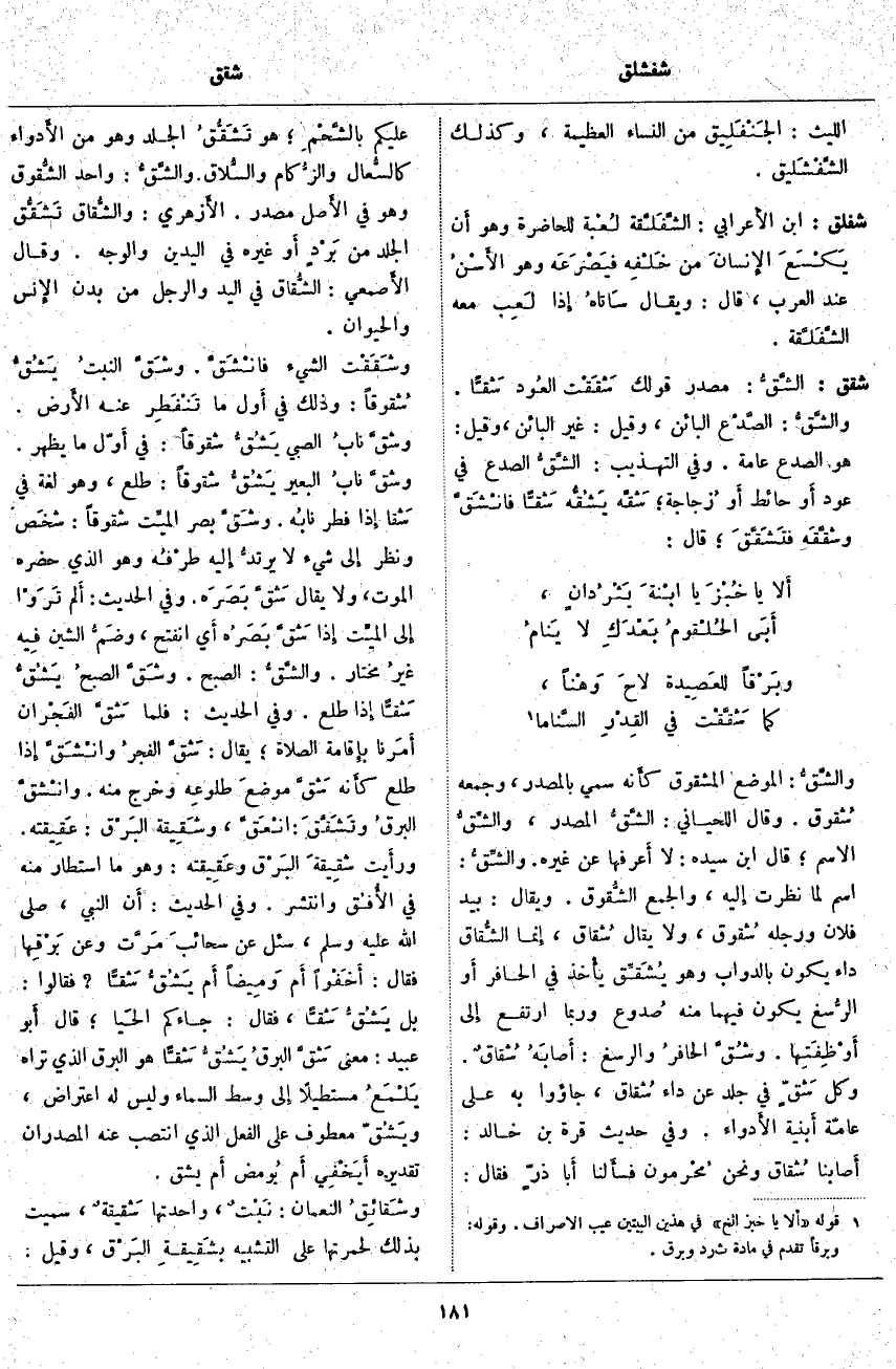 ؛ هُوَ تَشَقُّقُ الْجِلْدِ وَهُوَ مِنَ الأَدواء كالسُّعال والزُّكام والسُّلاق. والشَّقُّ: وَاحِدُ الشُّقوق وَهُوَ فِي الأَصل مَصْدَرٌ. الأَزهري: والشُّقاق تَشَقُّق الْجِلْدِ مِنْ بَرْدٍ أَو غَيْرِهِ فِي الْيَدَيْنِ وَالْوَجْهِ. وَقَالَ الأَصمعي: الشُّقاق فِي الْيَدِ وَالرَّجْلِ مِنْ بَدَنِ الإِنس وَالْحَيَوَانِ. وشَقَقْت الشَّيْءَ فانْشَقَّ. وشَقَّ النبتُ يَشُقُّ شُقوقاً: وَذَلِكَ فِي أَول مَا تَنْفَطِر عَنْهُ الأَرض. وشقَّ نابُ الصَّبِيِّ يَشُقُّ شُقُوقًا: فِي أَوّل مَا يَظْهَرُ. وشقَّ نابُ الْبَعِيرِ يَشُقُّ شُقُوقًا: طَلَعَ، وَهُوَ لُغَةٌ فِي شَقا إِذَا فَطَرَ نابُه. وشَقَّ بَصَرُ الميِّت شَقُوقًا: شخَص وَنَظَرَ إِلَى شَيْءٍ لَا يرتدُّ إِلَيْهِ طرْفُه وَهُوَ الَّذِي حَضَرَهُ الْمَوْتُ، وَلَا يُقَالُ شَقَّ بَصَرَه. وَفِي الْحَدِيثِ: