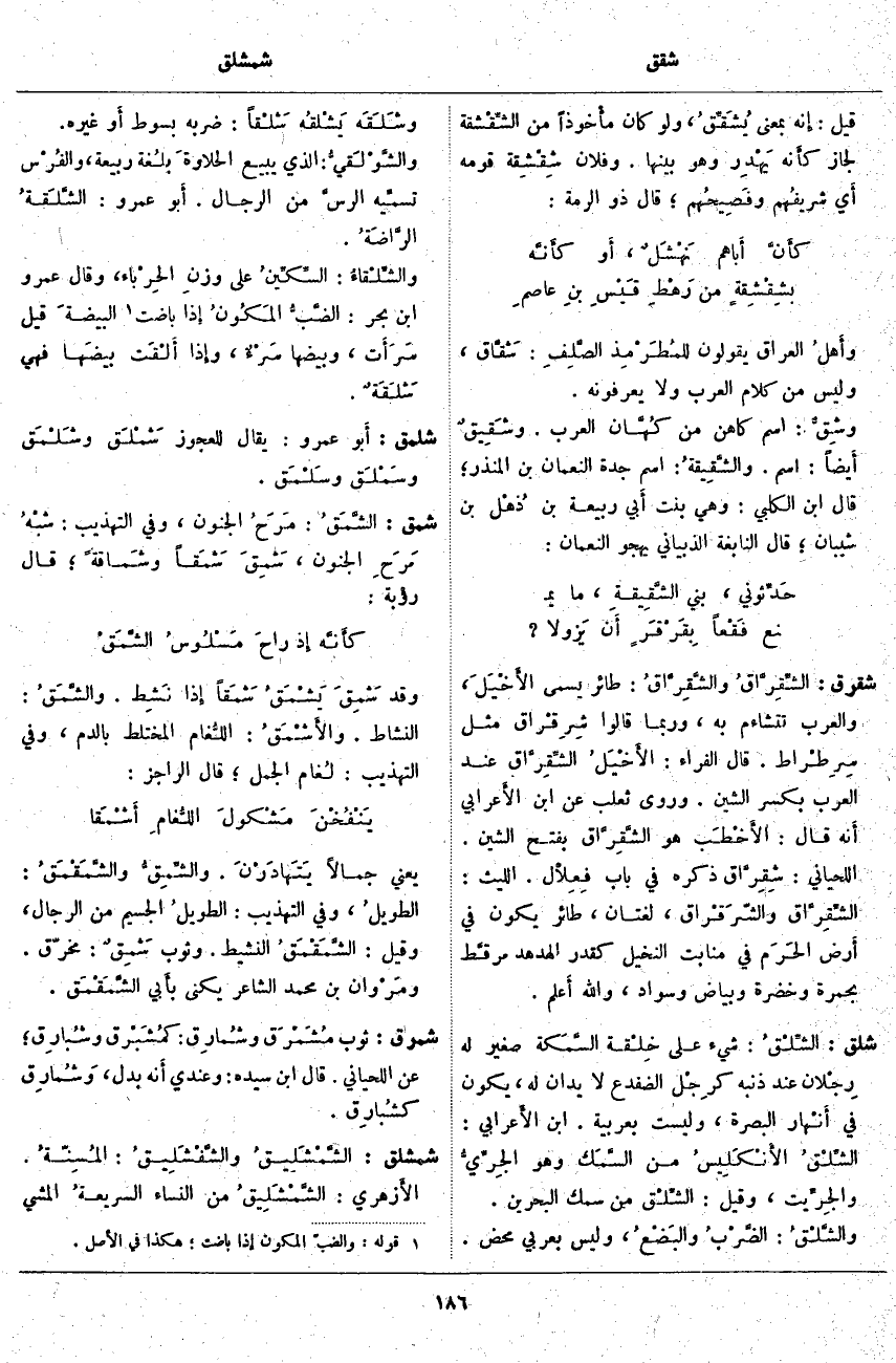شلق: الشِّلْقُ: شَيْءٌ عَلَى خِلْقة السَّمَكة صَغِيرٌ لَهُ رِجْلان عِنْدَ ذَنَبِهِ كرِجْل الضُّفْدَعِ لَا يُدَانُ لَهُ، يَكُونُ فِي أَنْهار الْبَصْرَةَ، وَلَيْسَتْ بِعَرَبِيَّةٍ. ابْنُ الأَعرابي: الشِّلْقُ الأَنْكَلِيسُ مِنَ السَّمَك وَهُوَ الجِرِّيُّ والجِرِّيت، وَقِيلَ: الشِّلْق مِنْ سَمَكِ الْبَحْرَيْنِ. والشَّلْقُ: الضَّرْبُ والبَضْعُ، وَلَيْسَ بِعَرَبِيٍّ مَحْضٍ. وشَلَقَه يَشْلقُه شَلْقاً: ضَرَبَهُ بِسَوْطٍ أَو غَيْرِهِ. والشَّوْلَقيُّ: الَّذِي يَبِيعُ الحلاوةَ بلُغة رَبِيعَةَ، والفُرْس تسمِّيه الرسَّ مِنَ الرِّجَالِ. أَبو عَمْرٍو: الشَّلَقَةُ الرَّاضَةُ. والشِّلْقَاءُ: السِّكِّينُ عَلَى وزنِ الحِرْباء، وَقَالَ عَمْرُو بْنُ بَحْرٍ: الضَّبُّ المَكُونُ إِذا بَاضَتِ «2» البيضةَ قِيلَ سَرَأَت، وَبَيْضُهَا سَرْءٌ، وإِذا أَلْقَت بيضَها فهي شَلَقَةٌ.