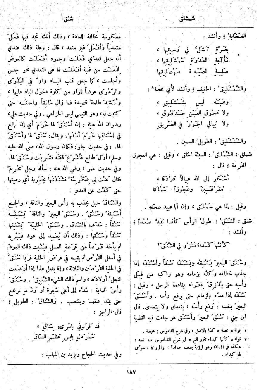 . وشَنَقَ البَعيرَ يَشْنِقُه ويَشْنُقُه شَنْقاً وأَشْنَقَه إِذَا جَذَبَ خِطَامَهُ وكفَّه بِزِمَامِهِ وَهُوَ رَاكِبُهُ مِنْ قِبَل رأْسِه حَتَّى يُلْزِقَ ذِفْراه بِقَادِمَةِ الرَّحْلِ، وَقِيلَ: شَنَقَه إِذَا مَدَّهُ بِالزِّمَامِ حَتَّى يَرْفَعَ رأْسه. وأَشْنَقَ البعيرُ بِنَفْسِهِ: رَفع رأْسَه، يَتَعَدَّى وَلَا يَتَعَدَّى. قَالَ ابْنُ جِنِّي: شَنَقَ البعيرَ وأَشْنَق هُوَ جَاءَتْ فِيهِ الْقَضِيَّةُ مَعْكُوسَةً مُخَالِفَةً لِلْعَادَةِ، وَذَلِكَ أَنك تَجِدُ فِيهَا فَعَلَ مُتَعَدِّيًا وأَفْعَلَ غَيْرَ مُتَعَدٍّ، قَالَ: وَعِلَّةُ ذَلِكَ عِنْدِي أَنه جَعَلَ تعدِّي فَعَلْت وَجُمُودَ أَفْعَلْت كَالْعِوَضِ لِفَعَلْت مِنْ غَلَبَةِ أَفْعَلْت لَهَا عَلَى التَّعَدِّي نَحْوَ جَلَسَ وأَجلست، كَمَا جُعِلَ قَلْبُ الْيَاءِ وَاوًا فِي البَقْوَى والرَّعْوَى عِوَضًا لِلْوَاوِ مِنْ كَثْرَةِ دُخُولِ الْيَاءِ عَلَيْهَا، وأُنْشِدَ طلحةُ قَصِيدَةً فَمَا زَالَ شانِقاً راحلتَه حَتَّى كَتَبَتْ لَهُ، وَهُوَ التَّيْمِيُّ لَيْسَ الْخُزَاعِيَّ. وَفِي حَدِيثِ