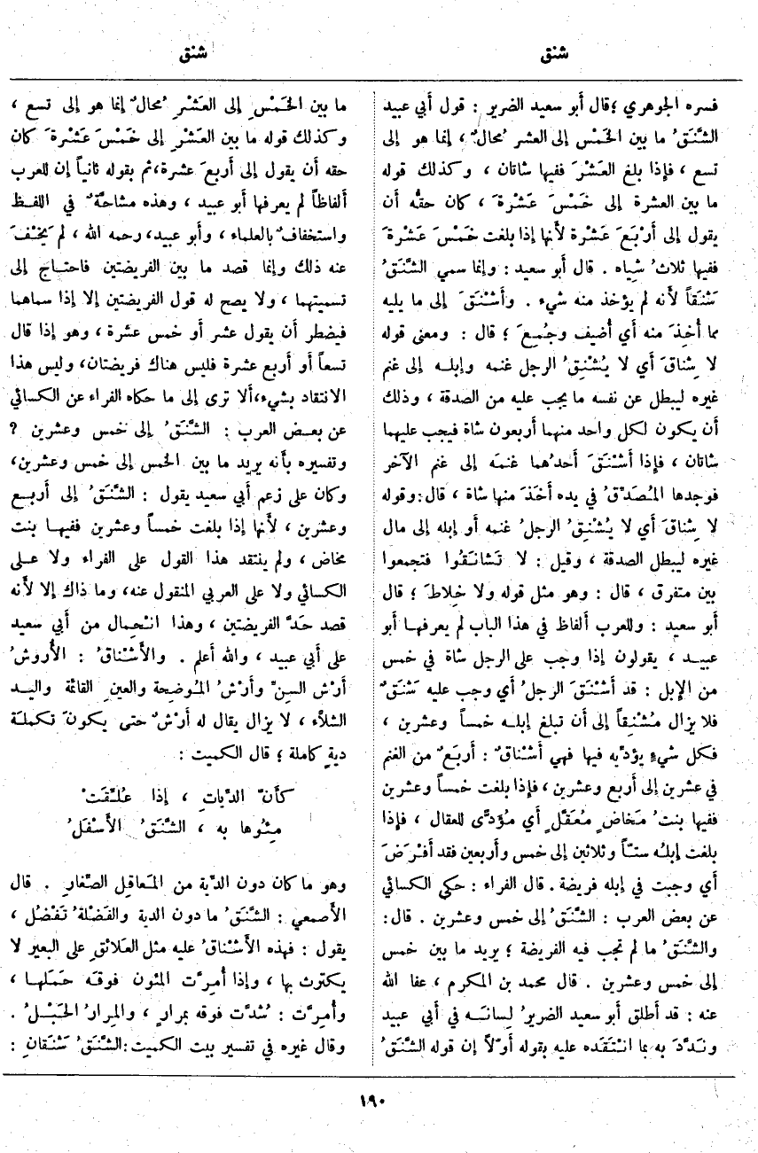 ؛ قَالَ أَبو سَعِيدٍ: وَلِلْعَرَبِ أَلفاظ فِي هَذَا الْبَابِ لَمْ يَعْرِفْهَا أَبو عُبَيْدٍ، يَقُولُونَ إِذَا وَجَبَ عَلَى الرَّجُلِ شَاةٌ فِي خَمْسٍ مِنَ الإِبل: قَدْ أَشْنَقَ الرجلُ أَي وَجَبَ عَلَيْهِ شَنَقٌ فَلَا يَزَالُ مُشْنِقاً إِلَى أَنْ تَبْلُغَ إِبِلُهُ خَمْسًا وَعِشْرِينَ، فَكُلُّ شَيْءٍ يؤدِّيه فِيهَا فَهِيَ أَشْناقٌ: أَربَعٌ مِنَ الْغَنَمِ فِي عِشْرِينَ إِلَى أَربع وَعِشْرِينَ، فَإِذَا بَلَغَتْ خَمْسًا وَعِشْرِينَ فَفِيهَا بنتُ مَخاضٍ مُعَقَّلٍ أَيْ مُؤَدًّى لِلْعِقَالِ، فَإِذَا بَلَغَتْ إبلُه سِتًّا وَثَلَاثِينَ إِلَى خَمْسٍ وأَربعين فَقَدْ أَفْرَضَ أَيْ وَجَبَتْ فِي إِبِلِهِ فَرِيضَةٌ. قَالَ الْفَرَّاءُ: حَكَى الْكِسَائِيُّ عَنْ بَعْضِ الْعَرَبِ: الشَّنَقُ إِلَى خَمْسٍ وَعِشْرِينَ. قَالَ والشَّنَقُ مَا لَمْ تَجِبْ فِيهِ الْفَرِيضَةُ؛ يُرِيدُ مَا بَيْنَ خَمْسٍ إِلَى خَمْسٍ وَعِشْرِينَ. قَالَ مُحَمَّدُ بْنُ الْمُكَرَّمِ، عَفَا اللَّهُ عَنْهُ: قَدْ أَطلق أَبو سَعِيدٍ الضريرُ لِسانَه فِي أَبي عُبَيْدٍ ونَدَّدَ بِهِ بِمَا انْتَقَده عَلَيْهِ بِقَوْلِهِ أَوّلًا إِنَّ قَوْلَهُ الشَّنَقُ مَا بَيْنَ الخَمْسِ إِلَى العَشْرِ مُحالٌ إِنَّمَا هُوَ إِلَى تِسْعٍ، وَكَذَلِكَ قَوْلُهُ مَا بَيْنَ العَشْرِ إِلَى خَمْسَ عَشْرةَ كَانَ حَقُّهُ أَن يَقُولَ إِلَى أَربعَ عَشْرَةَ، ثُمَّ بِقَوْلِهِ ثَانِيًا إِنَّ لِلْعَرَبِ أَلفاظاً لَمْ يَعْرِفْهَا أَبُو عُبَيْدٍ، وَهَذِهِ مشاحَّةٌ فِي اللَّفْظِ واستخفافٌ بِالْعُلَمَاءِ، وأَبو عُبَيْدٍ، رَحِمَهُ اللَّهُ، لَمْ يَخْفَ عَنْهُ ذَلِكَ وَإِنَّمَا قَصَدَ مَا بَيْنَ الْفَرِيضَتَيْنِ فَاحْتَاجَ إِلَى تَسْمِيَتِهِمَا، وَلَا يَصِحُّ لَهُ قَوْلُ الْفَرِيضَتَيْنِ إِلَّا إِذَا سَمَّاهُمَا فَيَضْطَرُّ أَنْ يقول عشر أَوْ خَمْسَ عَشْرَةَ، وَهُوَ إِذَا قَالَ تِسْعًا أَوْ أَرْبَعَ عَشْرَةَ فَلَيْسَ هُنَاكَ فَرِيضَتَانِ، وَلَيْسَ هَذَا الِانْتِقَادُ بِشَيْءٍ، أَلَا تَرَى إِلَى مَا حَكَاهُ الْفَرَّاءُ عَنِ الكسائي عن بعض العرب: الشَّنَقُ إِلَى خَمْسٍ وَعِشْرِينَ؟ وَتَفْسِيرُهُ بِأَنَّهُ يُرِيدُ مَا بَيْنَ الْخَمْسِ إِلَى خَمْسٍ وَعِشْرِينَ، وَكَانَ عَلَى زَعْمِ أَبِي سَعِيدٍ يَقُولُ: الشَّنَقُ إِلَى أَرْبَعٍ وَعِشْرِينَ، لأَنها إِذَا بَلَغَتْ خَمْسًا وَعِشْرِينَ فَفِيهَا بِنْتُ مَخَاضٍ، وَلَمْ يَنْتَقِدْ هَذَا الْقَوْلَ عَلَى الْفَرَّاءِ وَلَا عَلَى الْكِسَائِيِّ وَلَا عَلَى الْعَرَبِيِّ الْمَنْقُولِ عَنْهُ، وَمَا ذَاكَ إِلَّا لأَنه قَصَدَ حَدَّ الْفَرِيضَتَيْنِ، وَهَذَا انْحِمال مِنْ أَبِي سَعِيدٍ عَلَى أَبِي عُبَيْدٍ، وَاللَّهُ أَعْلَمُ. والأَشْناقُ: الأُروشُ أَرْش السِنُّ وأَرْشُ المُوضِحة والعينِ الْقَائِمَةِ وَالْيَدِ الشلَّاء، لَا يَزَالُ يُقَالُ لَهُ أَرْشٌ حَتَّى يكونَ تكملَة ديةٍ كَامِلَةٍ؛ قَالَ الْكُمَيْتُ: