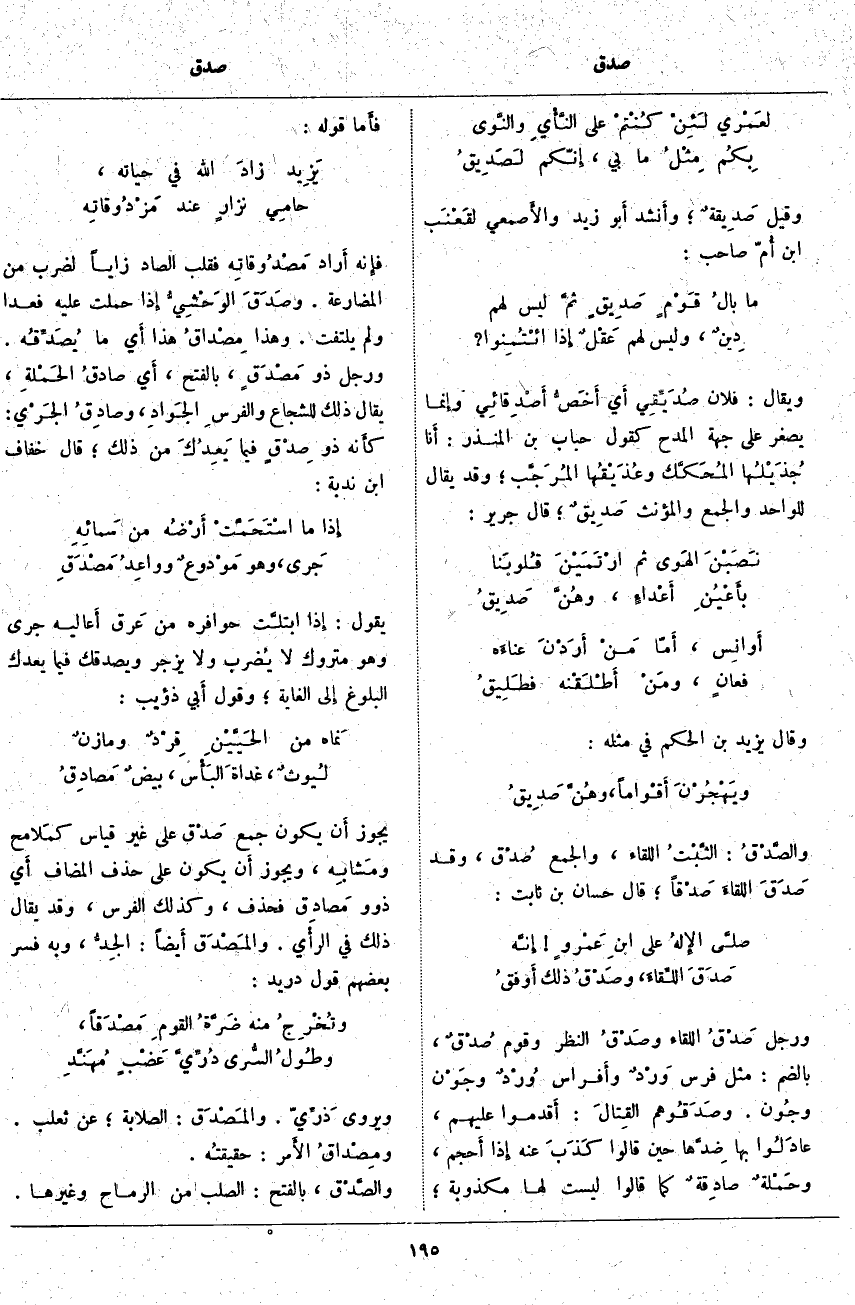 فإِنه أَراد مَصْدُوقاتِهِ فَقَلْبُ الصَّادِ زَايًا لِضَرْبٍ مِنَ الْمُضَارَعَةِ. وصَدَقَ الوَحْشِي إِذا حَمَلْتَ عَلَيْهِ فَعَدَا وَلَمْ يَلْتَفِتْ. وَهَذَا مِصْداقُ هَذَا أَي مَا يُصَدِّقُه. وَرَجُلٌ ذُو مَصْدَقٍ، بِالْفَتْحِ، أَي صادقُ الحَمْلةِ، يُقَالُ ذلك للشجاع والفرسِ الجَوادِ، وصادِقُ الجَرْي: كأَنه ذُو صِدْقٍ فِيمَا يَعِدُكَ مِنْ ذَلِكَ؛ قَالَ خُفَافُ بْنُ نُدْبَةَ: