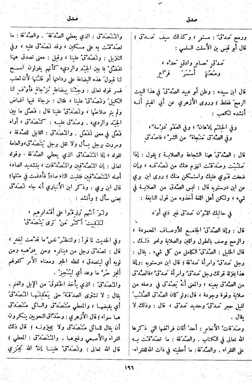 قَالَ: وإِنما الصَّدْقُ الْجَامِعُ للأَوصاف الْمَحْمُودَةِ، وَالرُّمْحُ يُوصَفُ بِالطُّولِ وَاللِّينِ وَالصَّلَابَةِ وَنَحْوَ ذَلِكَ. قَالَ الْخَلِيلُ: الصَّدْقُ الْكَامِلُ مِنْ كُلِّ شَيْءٍ. يُقَالُ: رَجُلٌ صَدْقٌ وامرأَة صَدْقة؛ قَالَ ابْنُ دُرُسْتَوَيْهِ؛ وإِنما هَذَا بِمَنْزِلَةِ قَوْلِكَ رَجُلٌ صَدْقٌ وامرأَة صَدْقٌ، فالصَّدْق مِنَ الصِّدْق بِعَيْنِهِ، وَالْمَعْنَى أَنه يَصْدُق فِي وَصْفِهِ مِنْ صَلَابَةٍ وَقُوَّةٍ وَجَوْدَةٍ، قَالَ: وَلَوْ كَانَ الصَّدْق الصُّلْبَ لَقِيلَ حَجَرٌ صَدْقٌ وَحَدِيدٌ صَدْق، قَالَ: وَذَلِكَ لَا يُقَالُ. وصَدَقاتُ الأَنعامِ: أَحدُ أَثمان فَرَائِضِهَا الَّتِي ذَكَرَهَا اللَّهُ تَعَالَى فِي الْكِتَابِ. والصَّدَقة: مَا تصَدَّقْت بِهِ عَلَى الْفُقَرَاءِ. والصَّدَقة: مَا أَعطيته فِي ذَاتِ اللَّهِ لِلْفُقَرَاءِ. والمُتَصَدِّق: الَّذِي يُعْطِي الصِّدَقَةَ. والصَّدَقة: مَا تصَدَّقْت بِهِ عَلَى مِسْكِينٍ، وَقَدْ تَصَدَّق عَلَيْهِ، وَفِي التَّنْزِيلِ: وَتَصَدَّقْ عَلَيْنا
