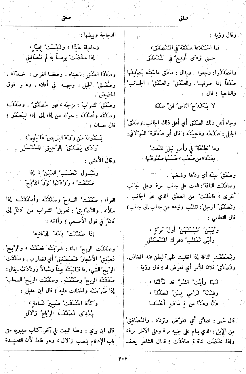 قَالَ شَمِرٌ: تصفَّق أَي تعرَّض وتردَّد. والمُصَافِقُ مِنَ الإِبل: الَّذِي يَنَامُ عَلَى جَنْبِهِ مَرَّةً وَعَلَى الْآخَرِ مَرَّةً، وإِذا مخَضَت النَّاقَةُ صافَقَت؛ قَالَ الشَّاعِرُ يَصِفُ الدَّجَاجَةَ وَبَيْضَهَا: