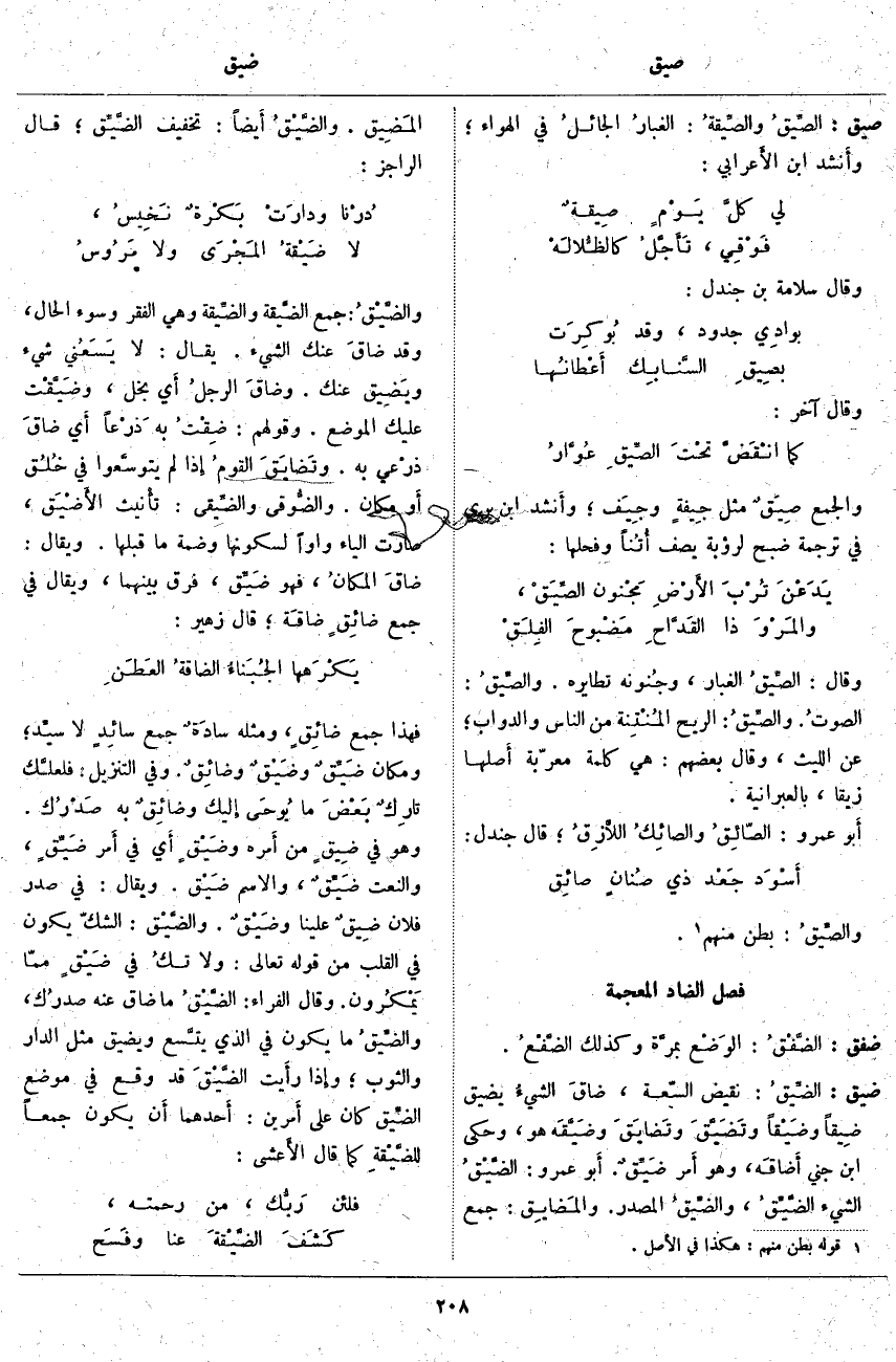 ضيق: الضِّيقُ: نَقِيضُ السَّعَةِ، ضاقَ الشيءُ يَضِيقُ ضِيقاً وضَيْقاً وتَضَيَّقَ وتَضايَقَ وضَيَّقَه هُوَ، وَحَكَى ابْنُ جِنِّي أَضاقَه، وَهُوَ أَمر ضَيِّقٌ. أَبو عَمْرٍو: الضَّيْقُ الشَّيْءُ الضَّيِّقُ، والضِّيقُ الْمَصْدَرُ، والمَضايِق: جَمْعُ المَضِيق. والضَّيْقُ أَيضاً: تَخْفِيفُ الضَّيِّق؛ قَالَ الرَّاجِزُ: