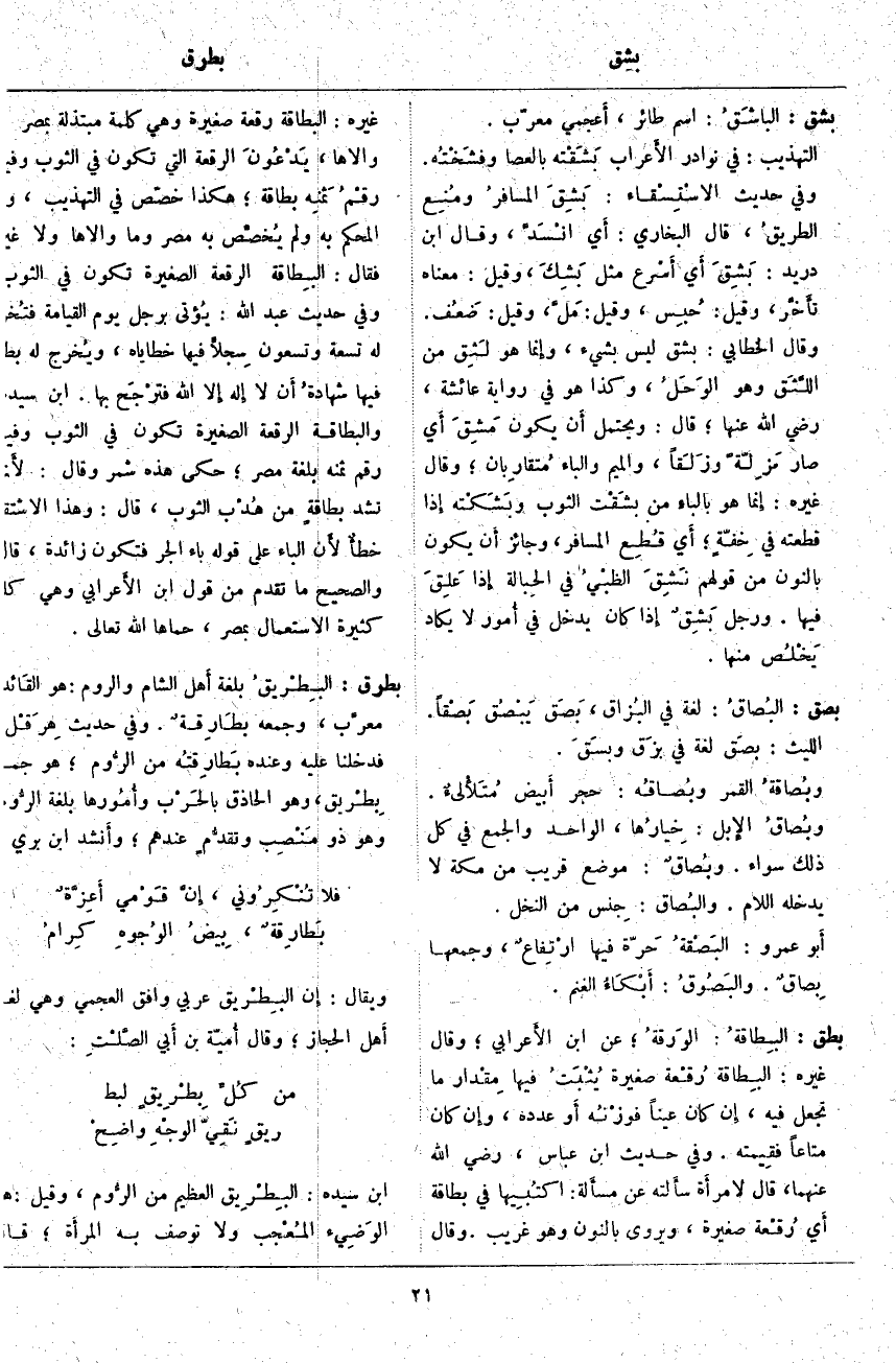 بطق: البِطاقةُ: الوَرقةُ؛ عَنِ ابْنِ الأَعرابي؛ وَقَالَ غَيْرُهُ: البِطاقة رُقْعة صَغِيرَةٌ يُثْبَتُ فِيهَا مِقْدار مَا تَجْعَلُ فِيهِ، إِنْ كَانَ عَيْنًا فوزْنُه أَو عَدَدُهُ، وَإِنْ كَانَ مَتَاعًا فقِيمته. وَفِي حَدِيثِ