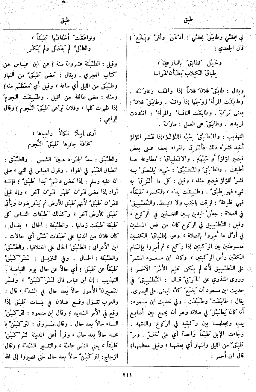 وَيُقَالُ: طابَقَ فلانٌ فُلَانًا إِذَا وافَقه وعاوَنَه. وطابَقَت المرأَةُ زوْجهَا إِذَا واتتْه. وطابَقَ فلانٌ: بِمَعْنَى مَرَنَ. وطابَقَت الناقةُ والمرأَةُ: انْقادت لِمُرِيدِهَا. وطابَقَ عَلَى الْعَمَلِ: مارَنَ. التَّهْذِيبِ: والمُطَبَّقُ شِبْه اللُّؤْلُؤ، إِذَا قُشر اللُّؤْلُؤُ أخِذ قشرهُ ذَلِكَ فأُلزِق بِالْغِرَاءِ بَعْضُهُ عَلَى بَعْضٍ فَيَصِيرُ لُؤْلُؤًا أَو شبْهَه. والانْطِباقُ: مُطاوعة مَا أَطْبَقْتَ. والطِّبْقُ والمُطَبَّقُ: شَيْءٌ يُلْصَقُ بِهِ قشرُ اللُّؤْلُؤِ فَيَصِيرُ مِثْلَهُ، وَقِيلَ: كُلُّ مَا أُلْزِقَ بِهِ شَيْءٌ فَهُوَ طِبْقٌ. وطَبِقَت يدُه، بِالْكَسْرِ، طَبَقاً، فَهِيَ طَبِقةٌ: لزِقت بِالْجَنْبِ وَلَا تَنْبَسِطُ. والتَّطْبِيقُ فِي الصَّلَاةِ: جعْلُ الْيَدَيْنِ بَيْنَ الْفَخِذَيْنِ فِي الرُّكُوعِ، وَقِيلَ: التَّطْبِيق فِي الرُّكُوعِ كَانَ مِنْ فِعْلِ الْمُسْلِمِينَ فِي أوَّل مَا أمِروا بِالصَّلَاةِ، وَهُوَ إطْباقُ الْكَفَّيْنِ مَبْسُوطَتَيْنِ بَيْنَ الرُّكْبَتَيْنِ إِذَا رَكَعَ، ثُمَّ أُمِروا بإلْقام الكفَّين رأُس الرُّكْبَتَيْنِ، وَكَانَ