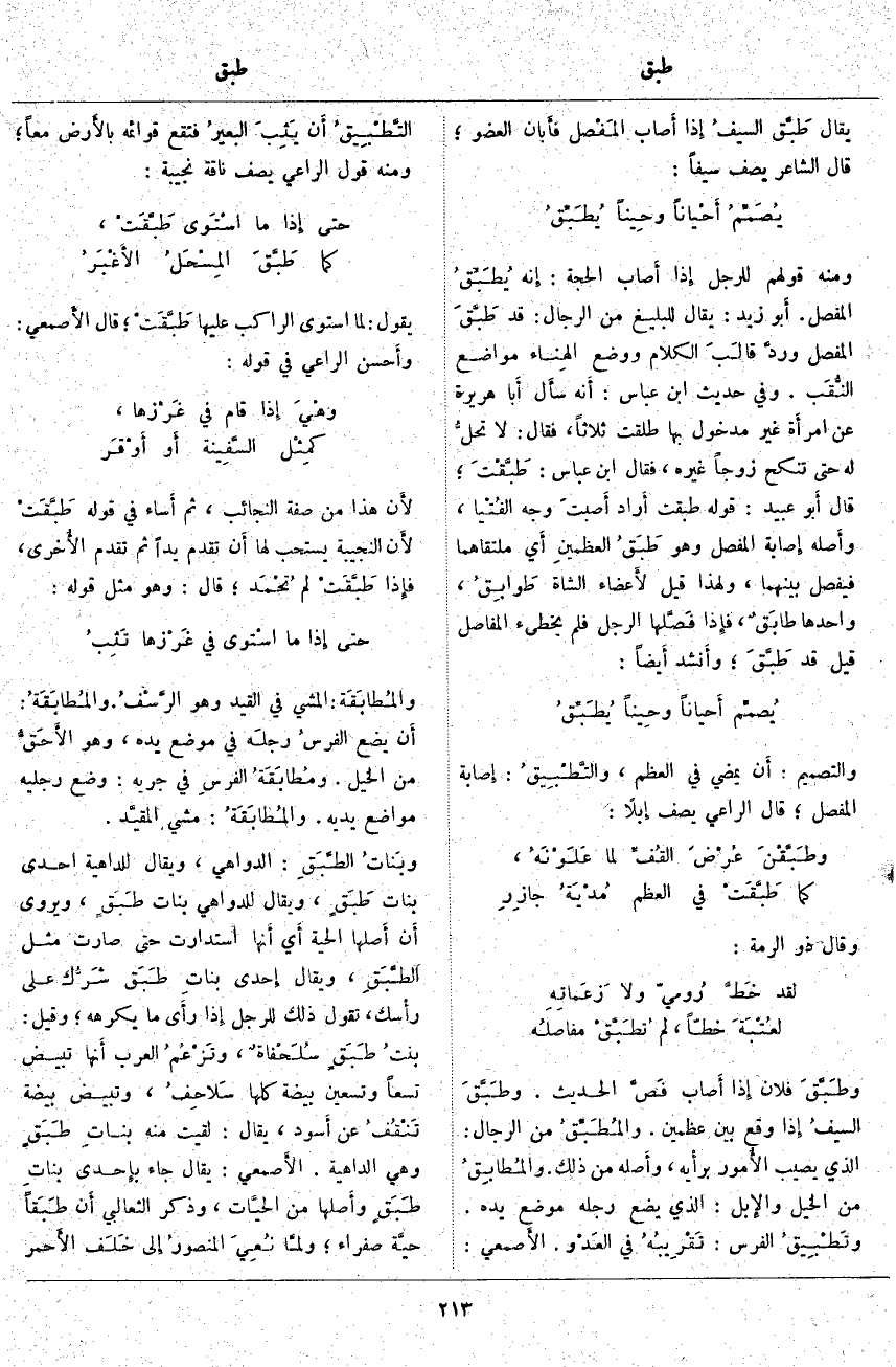 يُقَالُ طَبَّق السيفُ إِذا أَصاب المَفْصل فأَبان الْعُضْوَ؛ قَالَ الشَّاعِرُ يَصِفُ سَيْفًا: