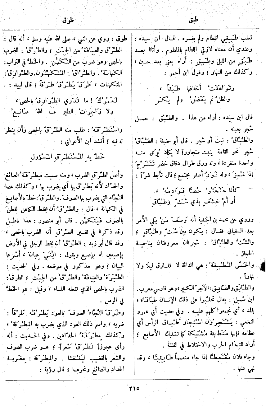 ؛ والطَّرْقُ: الضَّرْبُ بِالْحَصَى وَهُوَ ضَرْبٌ مِنَ التَّكَهُّنِ. والخَطُّ فِي التُّرَابِ: الكَهانَةُ. والطُّرَّاقُ: المُتكَهِّنُون. والطَّوارِقُ: الْمُتَكَهِّنَاتُ، طَرَقَ يَطْرُقُ طَرْقاً؛ قَالَ لَبِيَدٌ: