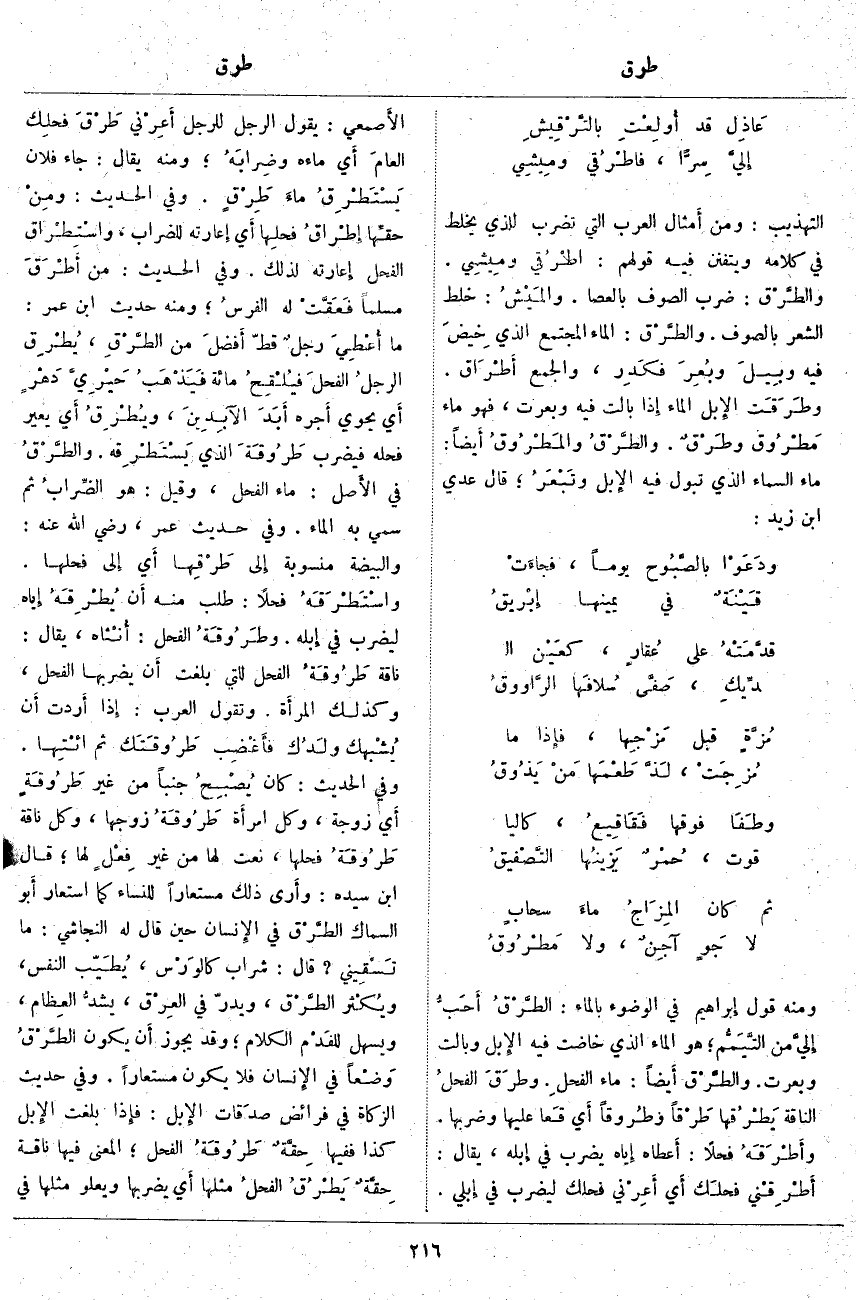 التَّهْذِيبُ: وَمِنْ أَمثال الْعَرَبِ الَّتِي تُضْرَبُ لِلَّذِي يَخْلِطُ فِي كَلَامِهِ وَيَتَفَنَّنُ فِيهِ قَوْلُهُمْ: اطْرُقي ومِيشِي. والطَّرْق: ضَرْبُ الصُّوفِ بِالْعَصَا. والمَيْشُ: خَلْطُ الشَّعْرِ بِالصُّوفِ. والطَّرْق: الْمَاءُ الْمُجْتَمِعُ الَّذِي خيضَ فِيهِ وبِيل وبُعِرَ فكَدِر، وَالْجَمْعُ أَطْرَاق. وطَرَقَت الإِبل الْمَاءَ إِذا بَالَتْ فِيهِ وَبَعَرَتْ، فَهُوَ مَاءٌ مَطْرُوق وطَرْقٌ. والطَّرْقُ والمَطرُوق أَيضاً: مَاءُ السَّمَاءِ الَّذِي تَبُولُ فِيهِ الإِبل وتَبْعَرُ؛ قَالَ عَدِيُّ بْنُ زَيْدٍ: