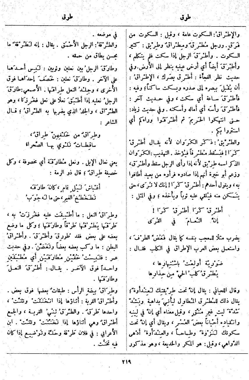 وَقَالَ اللِّحْيَانِيُّ: يُقَالُ إِنَّ تَحْتَ طِرِّيقتِك لَعِنْدأْوةً؛ يُقَالُ ذَلِكَ للمُطْرق المُطاوِل ليأْتِي بِدَاهِيَةٍ ويَشُدّ شَدّة ليثٍ غيرِ مُتّقٍ، وَقِيلَ معناه أَي إِن فِي لينِه وانْقيادِه أَحْياناً بعضَ العُسْرِ وَيُقَالُ أَي إِنَّ تَحْتَ سُكُوتِكَ لَنَزْوةً وطِماحاً، والعِنْدَأْوةُ أَدْهى الدَّواهي، وَقِيلَ: هُوَ الْمَكْرُ وَالْخَدِيعَةُ، وَهُوَ مَذْكُورٌ فِي مَوْضِعِهِ. والطُّرْقةُ: الرَّجُلُ الأَحْمَق. يُقَالُ: إِنه لَطُرْقةٌ مَا يُحْسِنُ يُطَاقُ مِنْ حُمْقِهِ. وطارَقَ الرجلُ بَيْنَ نَعْلَيْنِ وَثَوْبَيْنِ: لَبِس أَحدَهما عَلَى الْآخَرِ. وطارَقَ نَعْلَيْنِ: خَصَفَ إِحدَاهما فَوْقَ الأُخرى، وجِلْدُ النَّعْلِ طِراقُها. الأَصمعي: طارَقَ الرجلُ نَعْلَيْهِ إِذا أَطبَقَ نَعْلًا عَلَى نَعْلٍ فخُرِزَتا، وَهُوَ الطَّرّاق، والجلدُ الَّذِي يَضْرِبُهَا بِهِ الطِّراقُ؛ قَالَ الشَّاعِرُ: