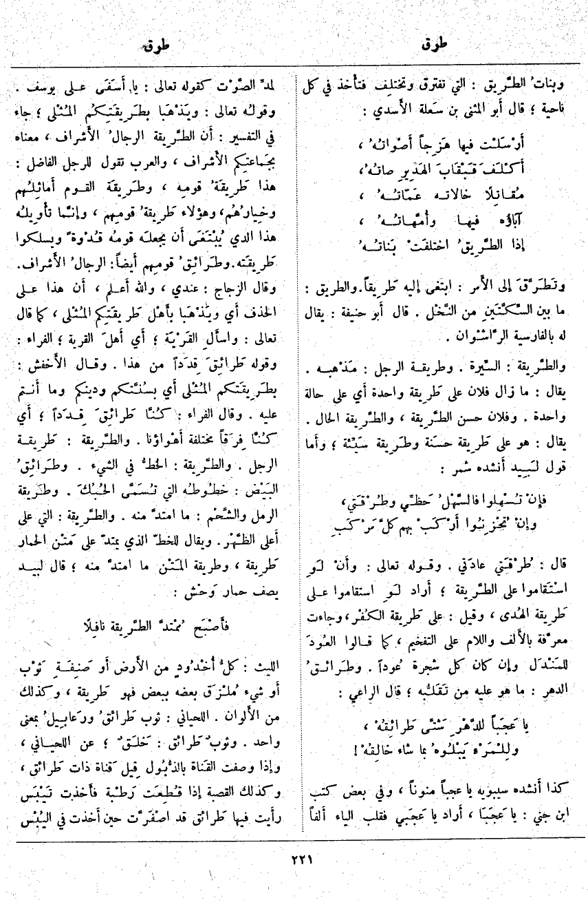 ؛ أَراد لَوِ اسْتَقَامُوا عَلَى طَرِيقة الهُدى، وَقِيلَ، عَلَى طَريقة الكُفْر، وَجَاءَتْ معرَّفة بالأَلف وَاللَّامِ عَلَى التَّفْخِيمِ، كَمَا قَالُوا العُودَ للمَنْدَل وإِن كَانَ كُلُّ شَجَرَةٍ عُوداً. وطَرائقُ الدَّهْرِ: مَا هُوَ عَلَيْهِ مِنْ تَقَلُّبه؛ قَالَ الرَّاعِي: